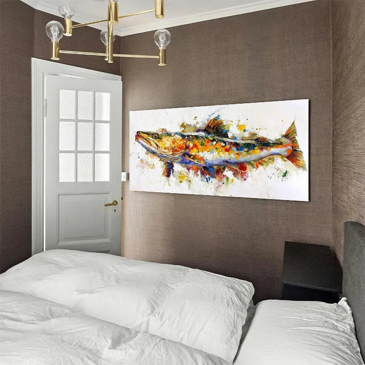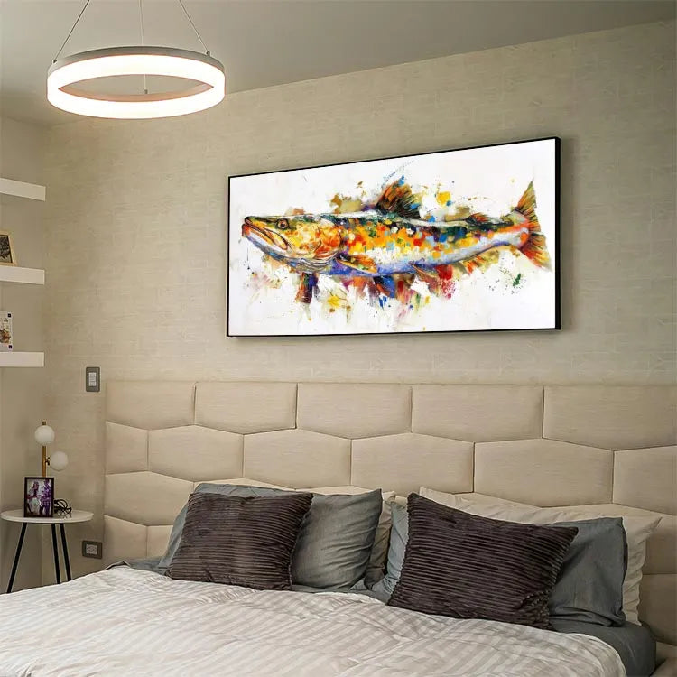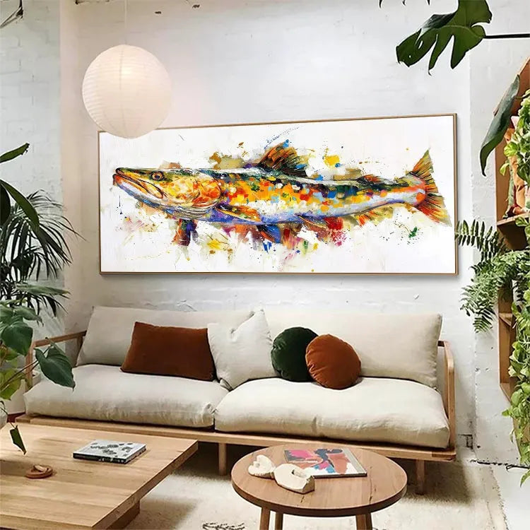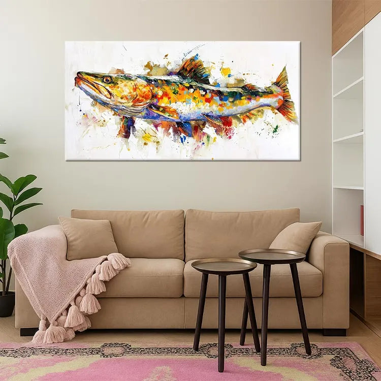This vibrant watercolor painting of a fish employs a splatter technique that blends abstract expressionism with realism. The use of bright, varied colors—yellow, orange, blue, and green—creates a dynamic, almost explosive effect, while the fish's detailed, textured form remains the focal point. The artist skillfully balances the abstract splatters with the fish's structured form, suggesting movement and vitality. The light, fluid brushstrokes and the interplay of color and texture evoke a sense of spontaneity and energy, characteristic of the abstract expressionist movement. The white background enhances the vividness of the colors, drawing attention to the fish's intricate details and the chaotic beauty of its surroundings.
