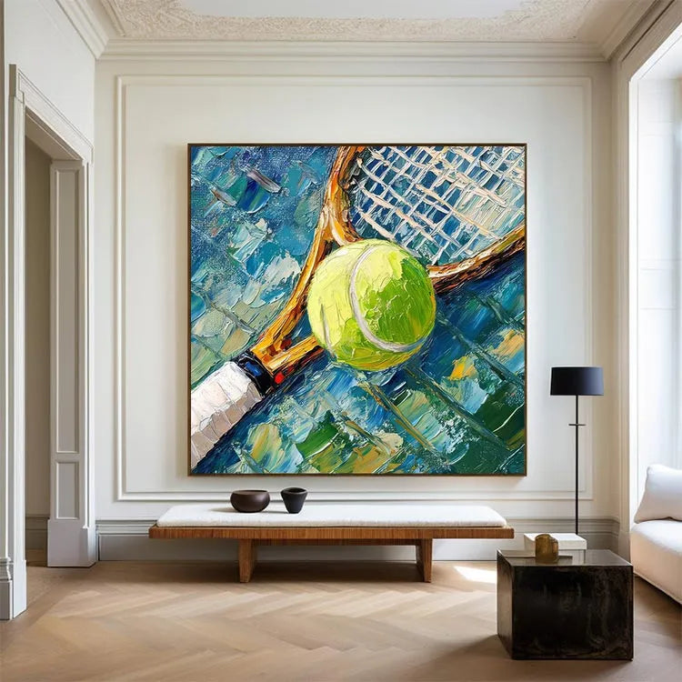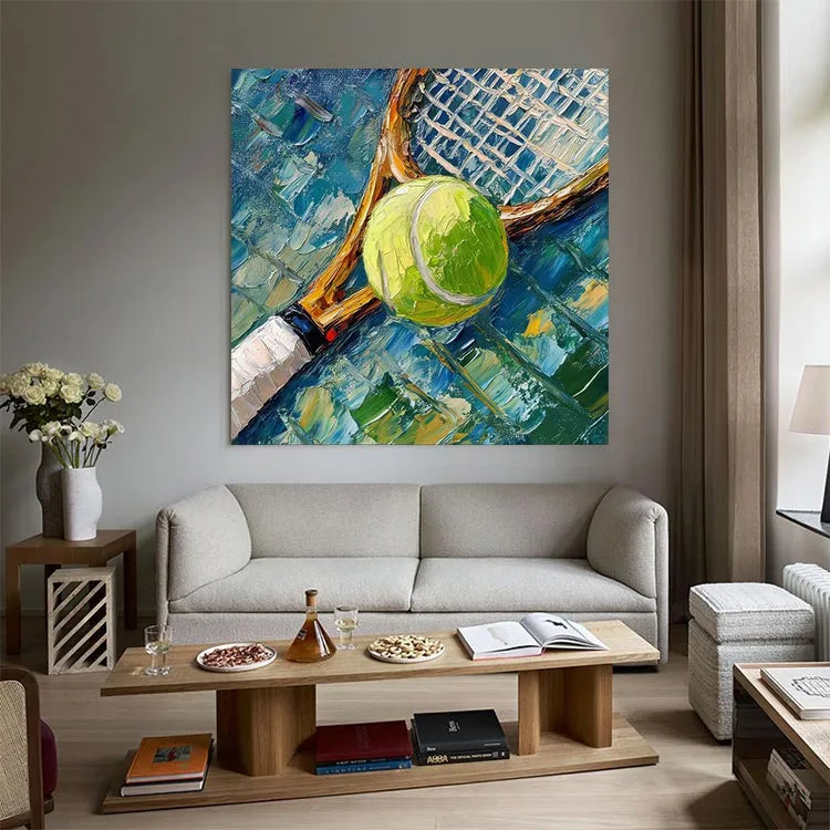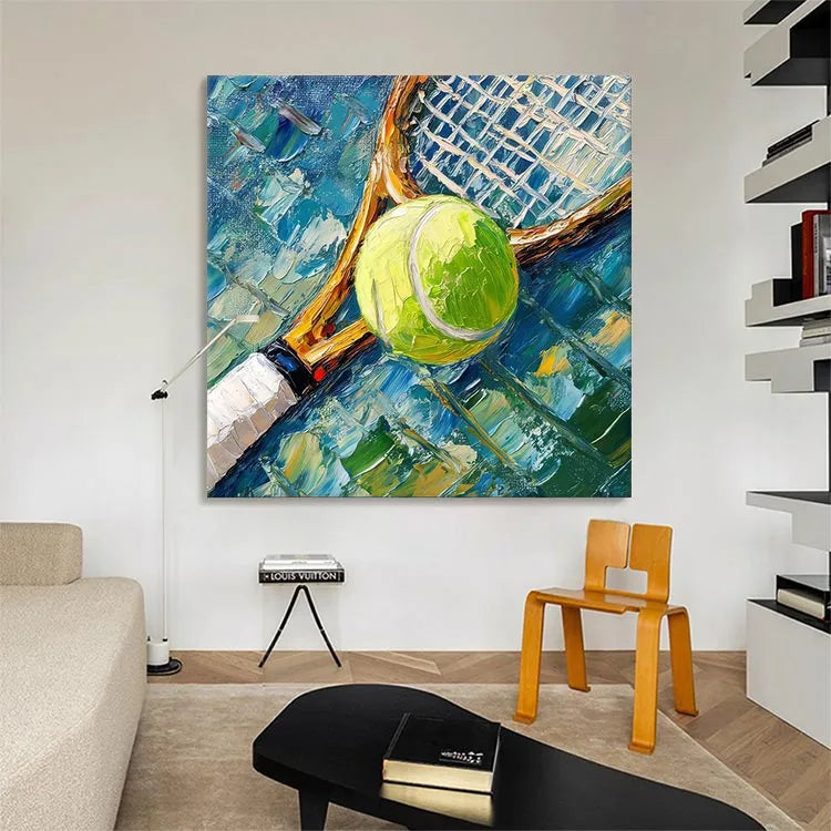 This vibrant painting captures a tennis ball in mid-air, intersecting with a tennis racket, utilizing an impressionistic style. The artist employs thick, textured brushstrokes, creating a dynamic sense of movement and energy. The color palette is rich, with vivid greens, blues, and yellows, contrasting sharply to draw attention to the central tennis ball. The light source appears to be natural, as suggested by the bright highlights and subtle shadows. The textured brushwork adds a tactile quality, reminiscent of the style of artists like Claude Monet. The composition's diagonal orientation adds a sense of action and spontaneity, while the detailed rendering of the racket and ball symbolizes the intersection of sport and art.