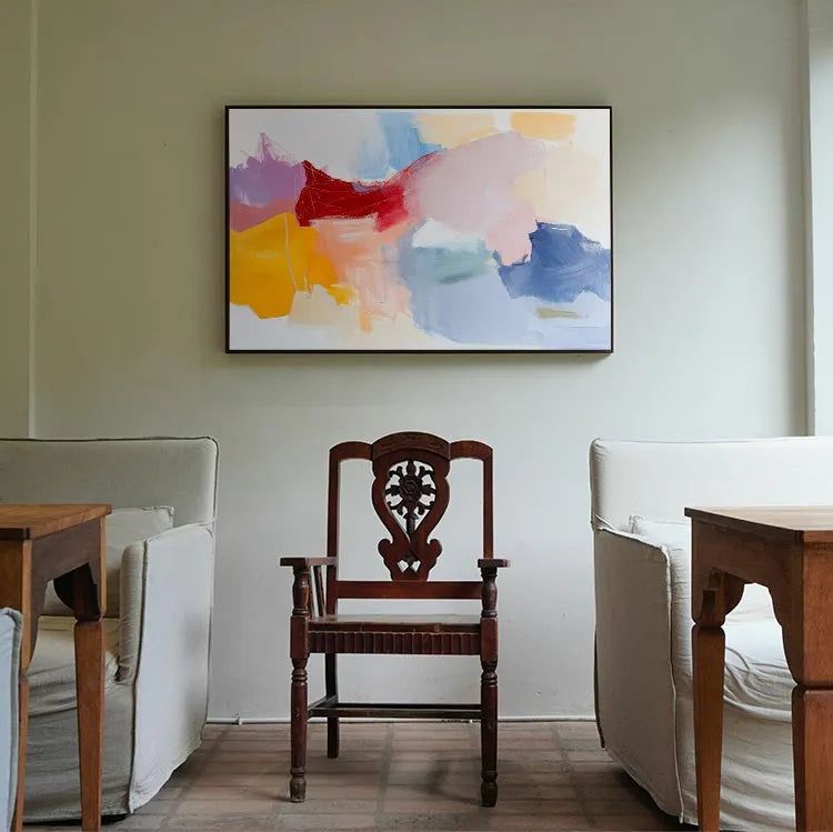 This abstract painting employs a vibrant, yet harmonious, color palette dominated by red, yellow, pink, blue, and white. The broad, textured brushstrokes create a dynamic, almost fluid composition, evoking a sense of movement and depth. The red, positioned centrally, draws the eye, while the surrounding colors provide a subtle contrast, enhancing its prominence. The use of thick, impasto textures adds a tactile quality, emphasizing the physicality of the brushstrokes. The interplay of light and dark areas within the colors suggests a three-dimensional aspect, reminiscent of the Abstract Expressionist movement. The overall style is modern and expressive, with a focus on color and texture rather than form or realism.