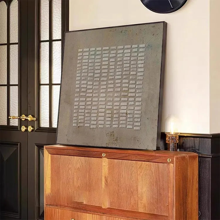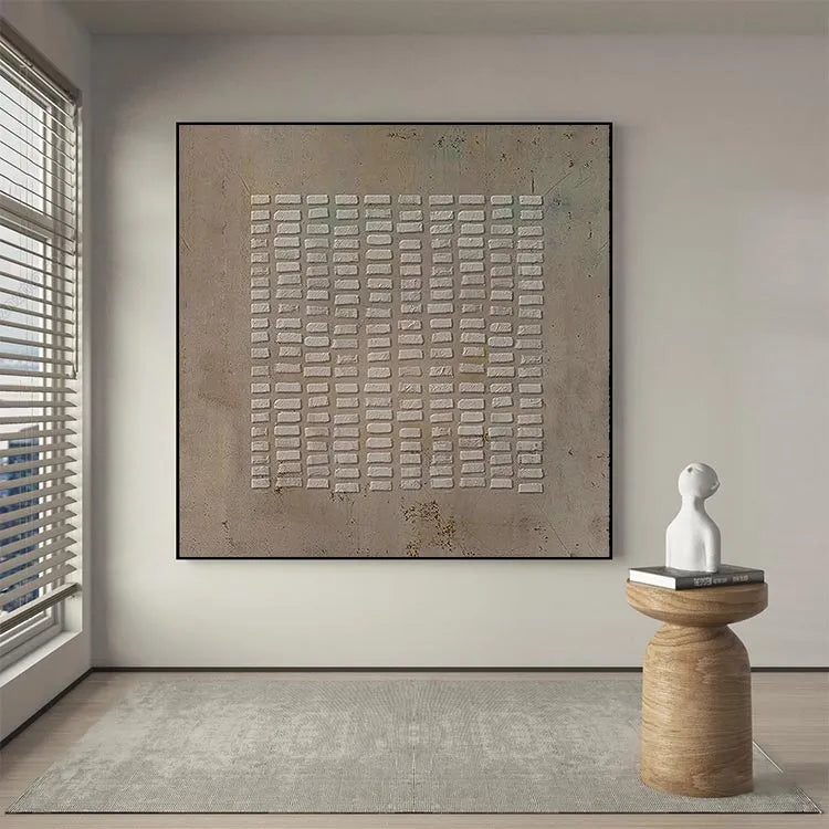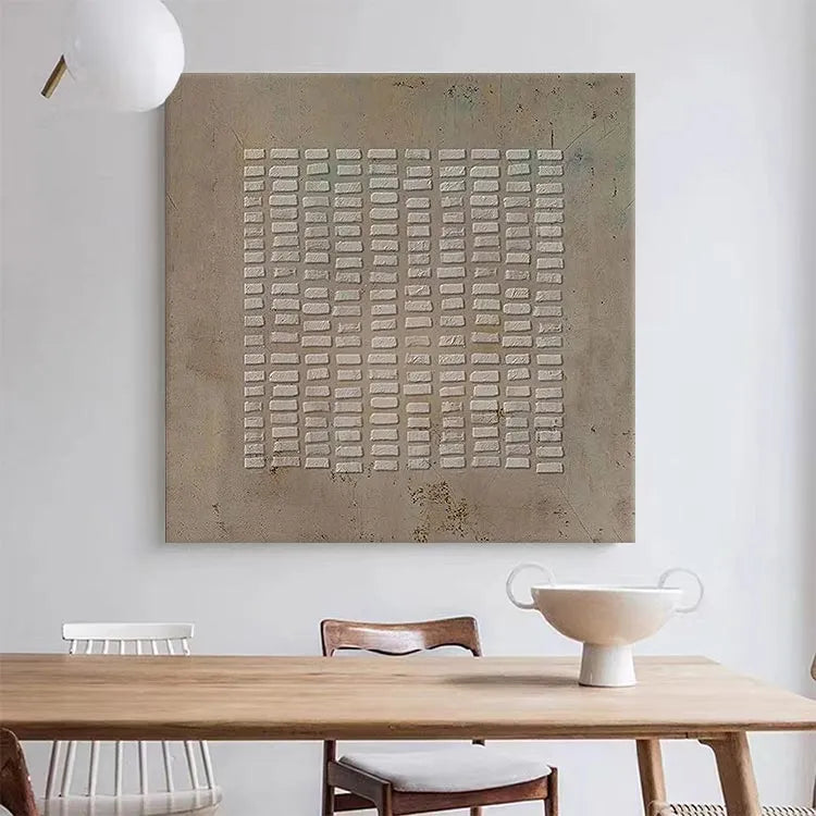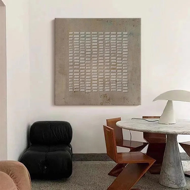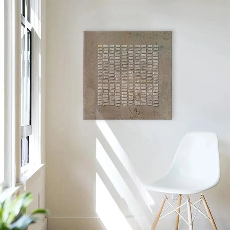 This minimalist painting features a grid of rectangular white bricks against a textured, beige background. The composition is symmetrical, emphasizing order and repetition. The use of color is restrained, with the white bricks starkly contrasting the muted background, creating a sense of depth and focus. The texture of the background suggests a rough, possibly concrete surface, adding an industrial feel. The light is diffuse, evenly illuminating the bricks, which highlights their three-dimensional quality. This work aligns with the principles of Minimalism, focusing on simplicity and the inherent beauty of form. The subtle color variations and textures evoke a sense of quiet contemplation and subtle symbolism of structure and stability.