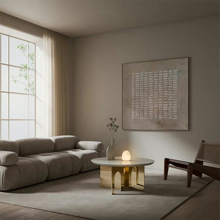 This minimalist artwork features a grid of rectangular, textured tiles arranged in a square pattern against a muted, textured background. The tiles have a subtle, embossed design, adding a tactile quality to the piece. The composition is highly geometric, evoking a sense of order and symmetry. The use of a limited color palette—primarily beige and off-white—creates a calm, neutral mood. The texture of the tiles contrasts with the rougher, more organic texture of the background, highlighting the precision of the grid against the randomness of the backdrop. This work aligns with the principles of Minimalism, focusing on simplicity, form, and subtle texture. The overall effect is meditative and contemplative.