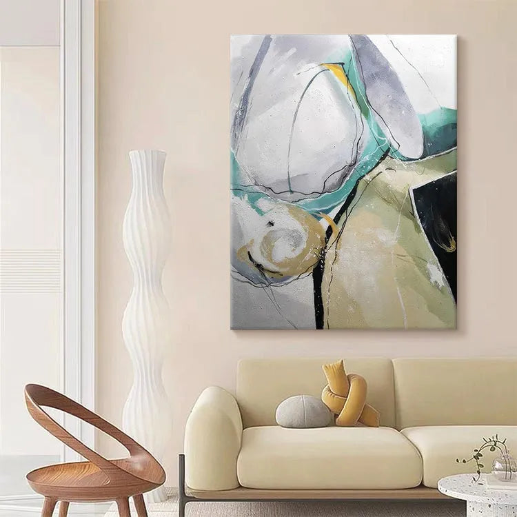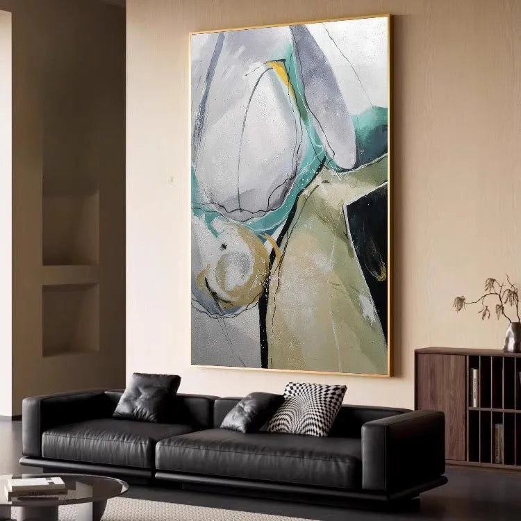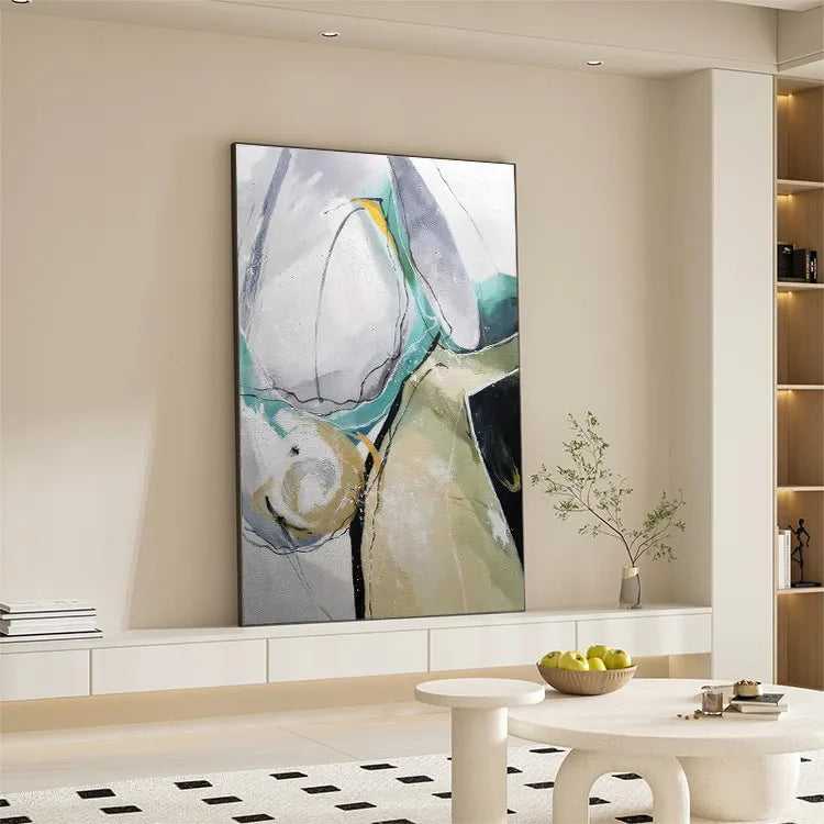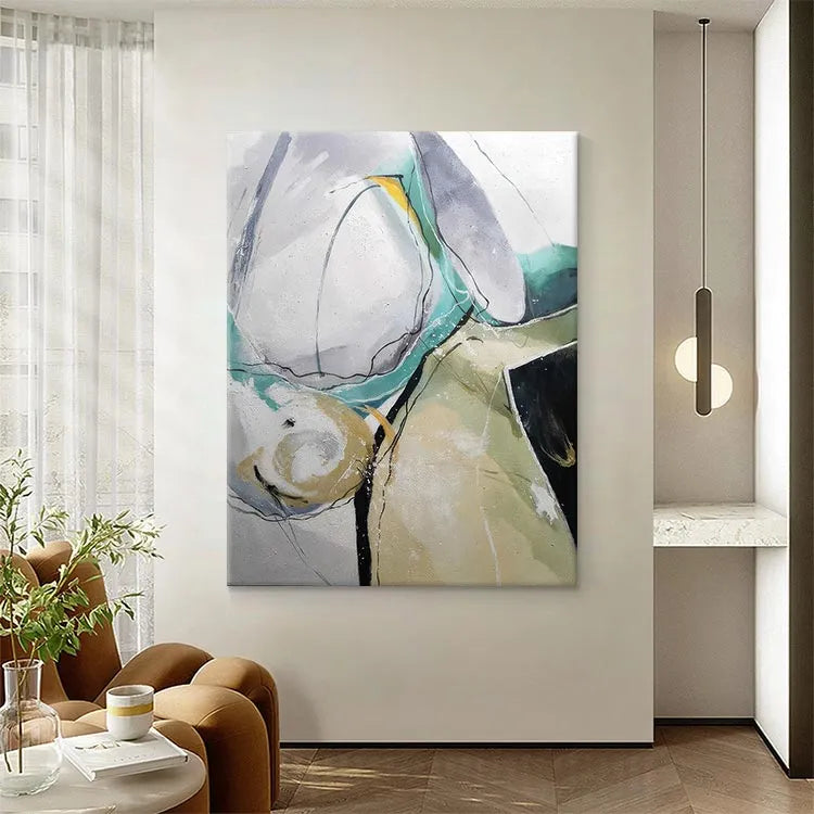 This abstract oil painting employs a restrained palette of muted greens, grays, and yellows, with bold black lines intersecting the composition. The textured surface, with visible brushstrokes and subtle impasto, adds depth and tactile quality. The use of color and line suggests a dialogue between geometric and organic forms, evoking a sense of movement and fluidity. The light green and yellow accents introduce a subtle warmth, contrasting with the cool grays and blacks. This work may belong to the Abstract Expressionism movement, characterized by its spontaneous creation and emotional intensity. The composition's asymmetry and the interplay of light and dark areas create a dynamic, yet balanced, visual experience.
