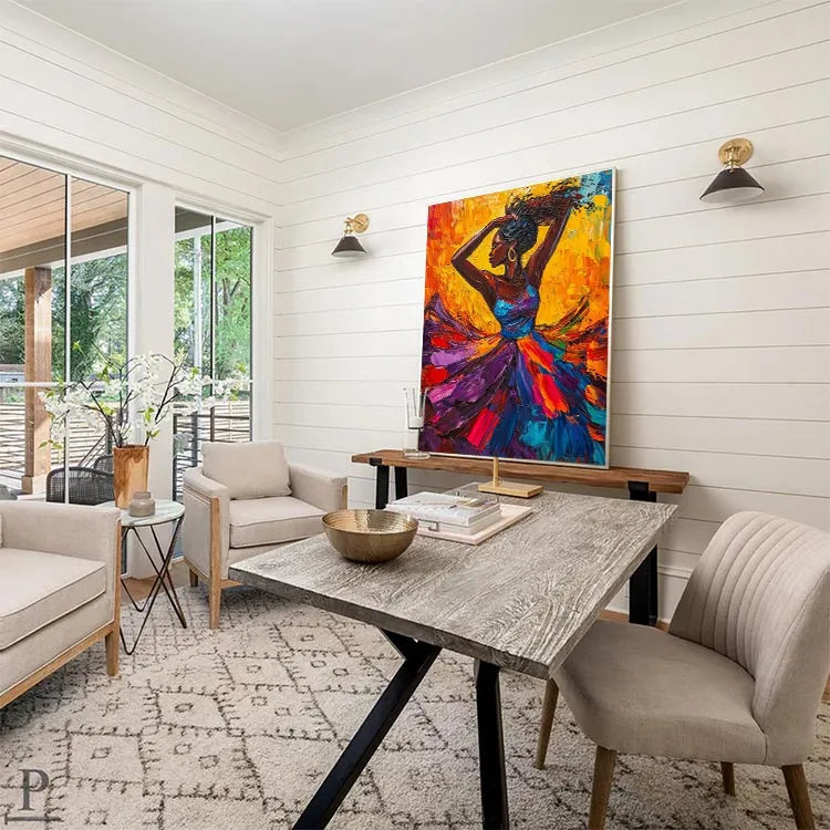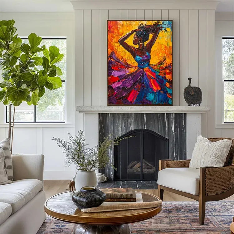 This vibrant painting, likely influenced by the Fauvist movement, showcases dynamic brushstrokes and a rich, expressive use of color. The dark-skinned female figure, adorned in a vividly multicolored dress, stands against a fiery orange-yellow background, evoking a sense of warmth and movement. Her raised arms and poised posture suggest a moment of grace and confidence. The textured, almost abstract application of paint in the dress contrasts with the smoother, more defined strokes of her face and hair, highlighting her elegance. The use of color, particularly the bold interplay of purples, reds, and blues, adds a sense of emotional intensity and fluidity. The large, gold hoop earrings provide a subtle yet striking focal point, enhancing the composition's balance and rhythm.