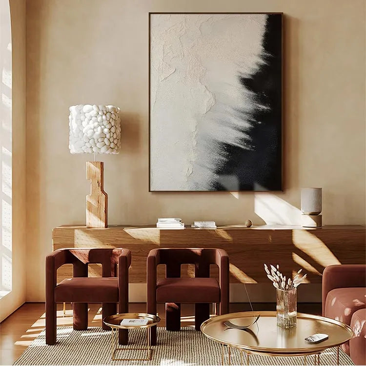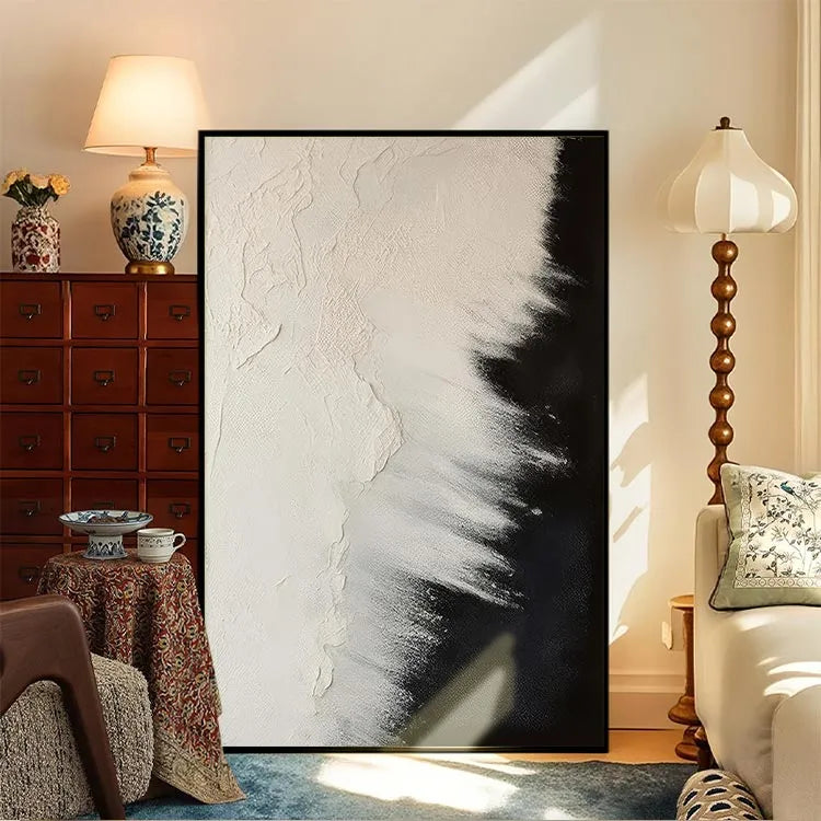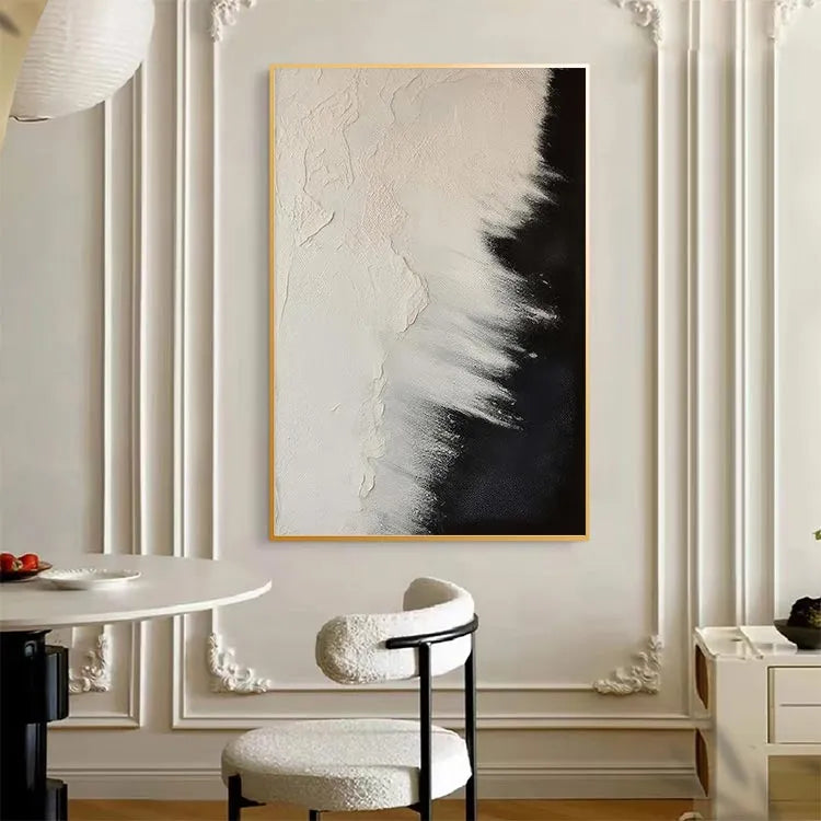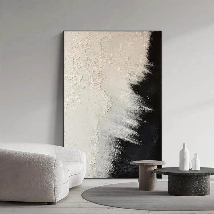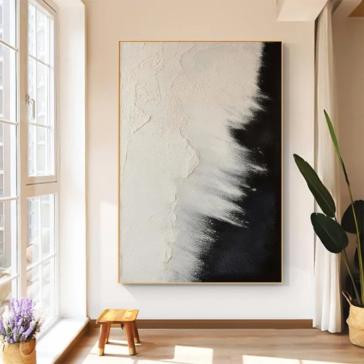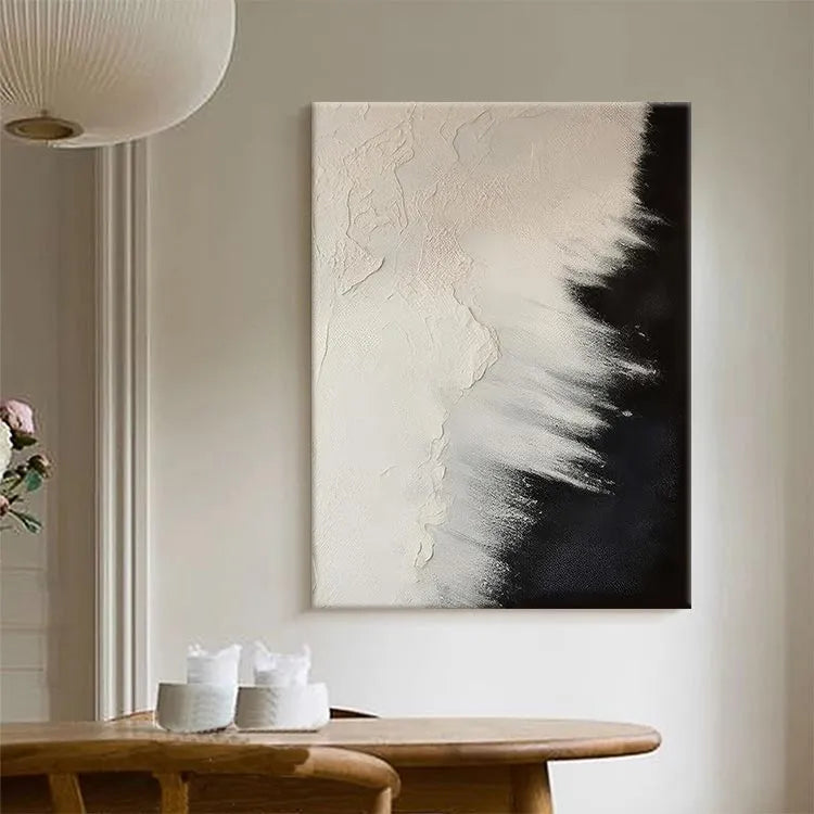 This oil painting employs a minimalist yet expressive approach, characterized by its stark contrast between the white and black areas. The textured brushstrokes on the left side create a rough, almost tactile surface, while the right side transitions smoothly from white to black with delicate, sweeping strokes. The interplay of light and dark suggests a movement between clarity and mystery, potentially symbolizing the duality of existence. The composition's vertical division and textured contrast evoke the Abstract Expressionism movement, with its emphasis on emotional and psychological depth. The subtle gradation and brushwork technique add a layer of complexity, inviting the viewer to explore the unseen narratives within the painting.