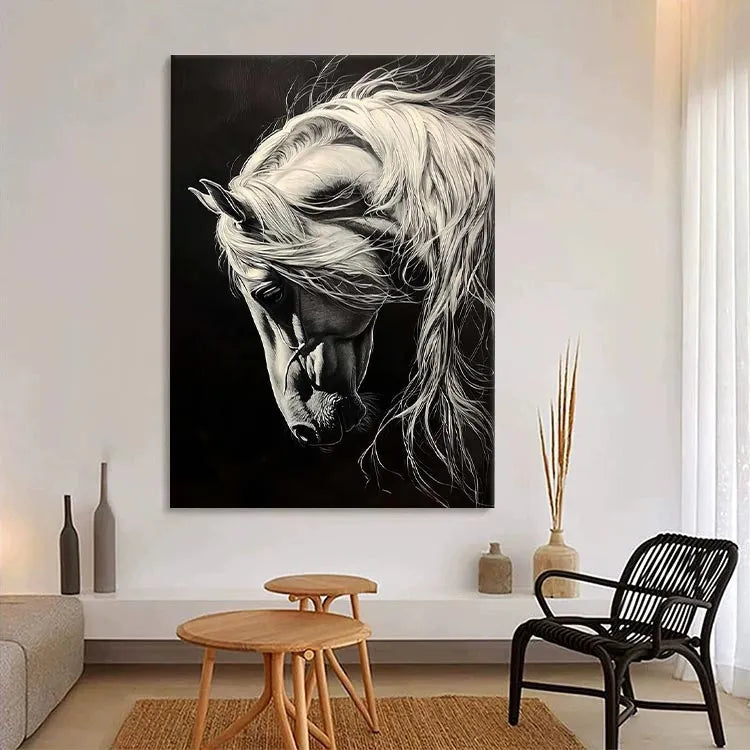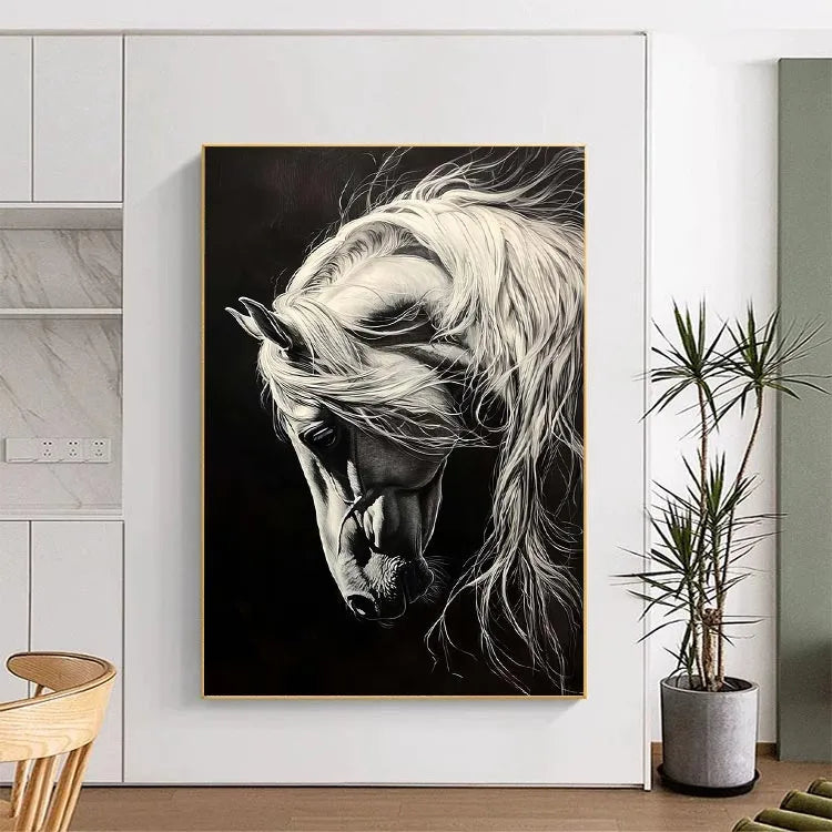 This monochromatic painting of a horse's head, executed in a realistic style, showcases meticulous attention to detail and texture. The artist employs a limited color palette, relying predominantly on shades of black and white to create a striking contrast. The flowing mane, rendered with delicate, wispy brushstrokes, adds a dynamic sense of movement, while the horse's calm, introspective gaze is captured with precise, almost lifelike, line work. The use of light and shadow is masterful, highlighting the horse's muscular contours and the subtle texture of its fur. The composition's vertical orientation and the horse's downward gaze suggest a contemplative mood. This work aligns with the realism movement, emphasizing accuracy and emotional depth through detailed representation.