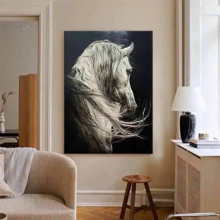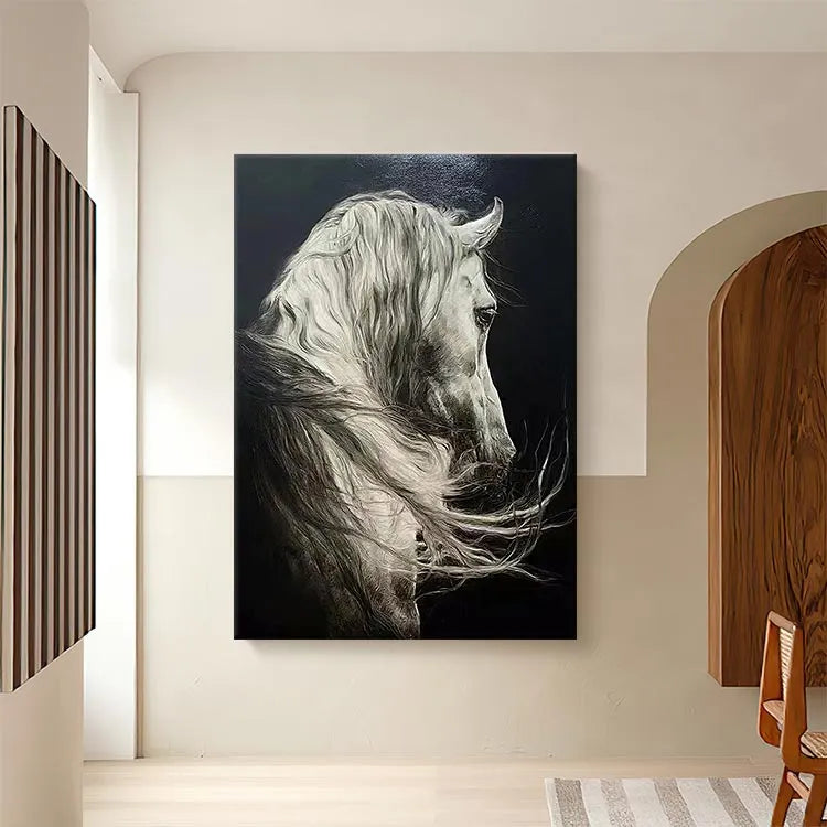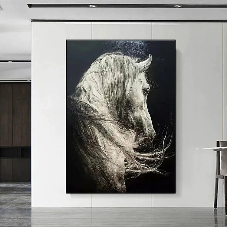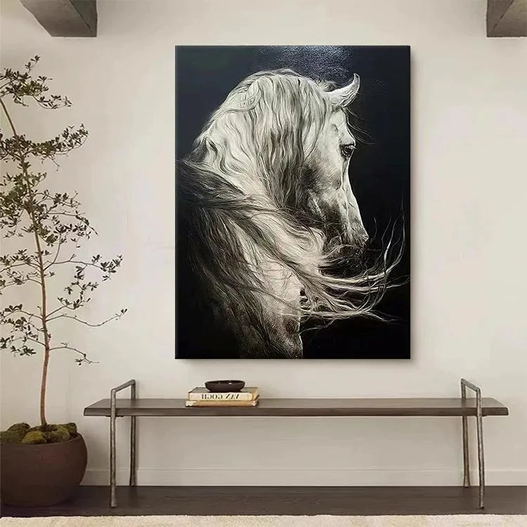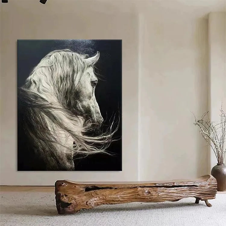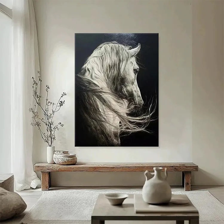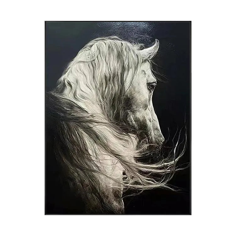 This painting, likely a digital artwork, portrays a side profile of a majestic white horse with flowing mane. The composition emphasizes the horse's elegant profile and the dynamic movement of its mane, which creates a sense of fluidity and grace. The artist employs a monochromatic palette, primarily using shades of white, gray, and black, which enhances the horse's ethereal and almost mythical presence. The use of light and shadow is masterful, with the light source subtly illuminating the horse's face and mane, creating a delicate, almost glowing effect. The texture of the brushstrokes is finely detailed, especially in the mane, adding a sense of realism. This work aligns with the Romantic movement's emphasis on emotion and the sublime, and it evokes a sense of tranquility and nobility. The minimalistic background ensures the viewer's focus remains on the horse, making it the central and most compelling element of the piece.