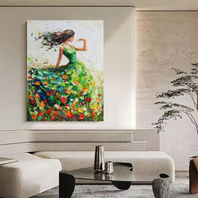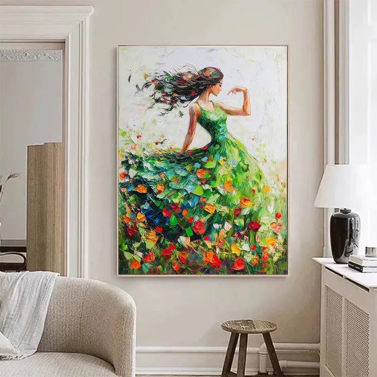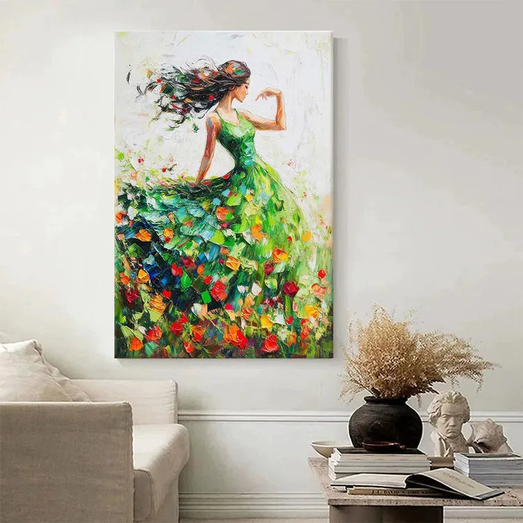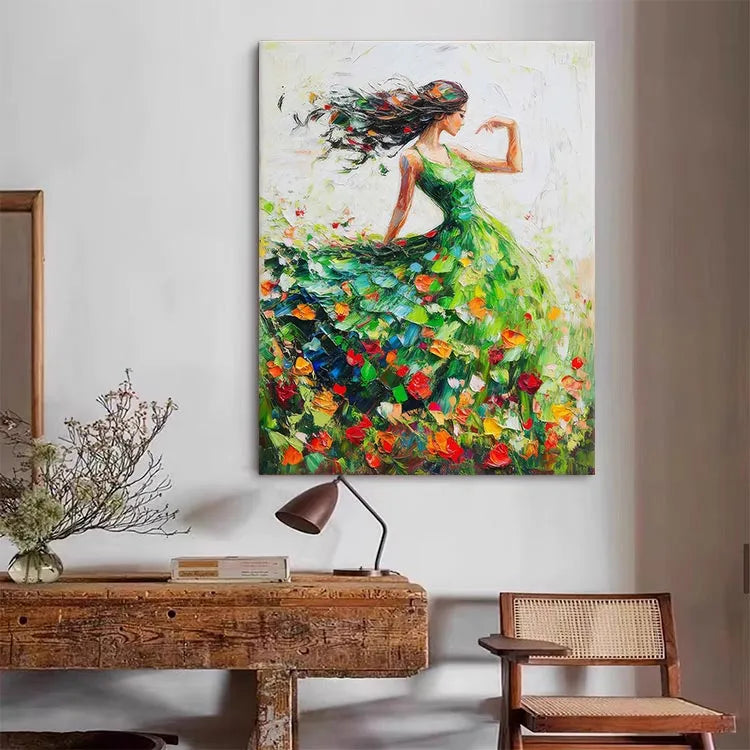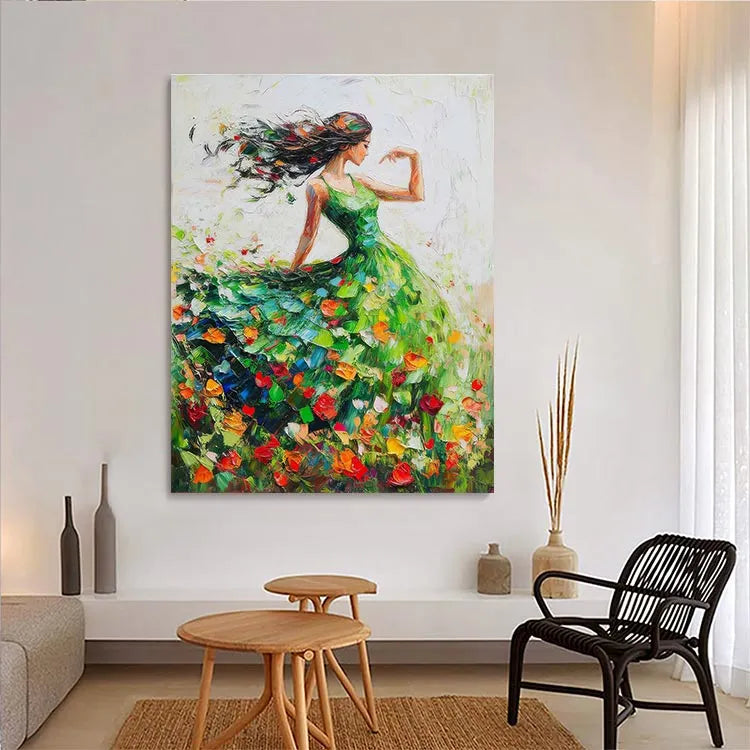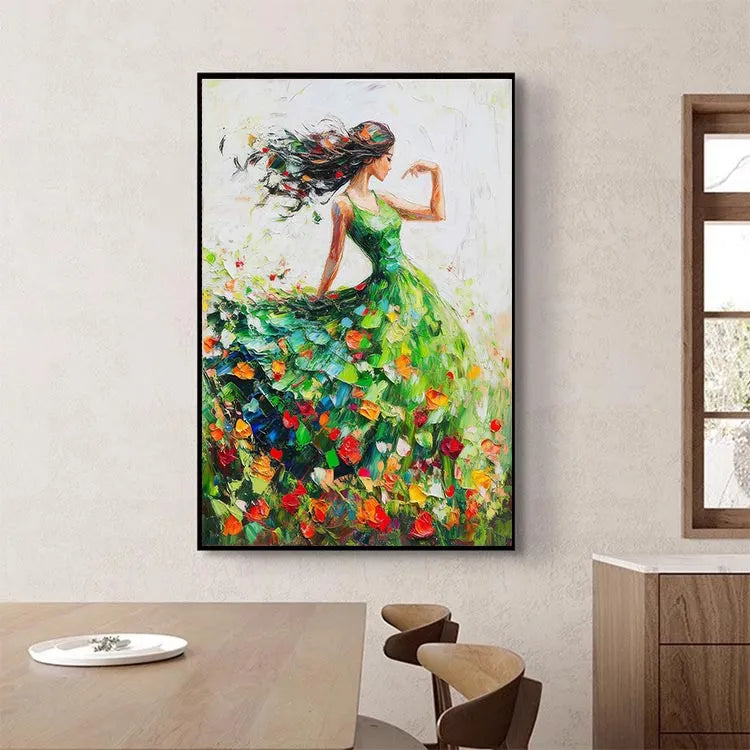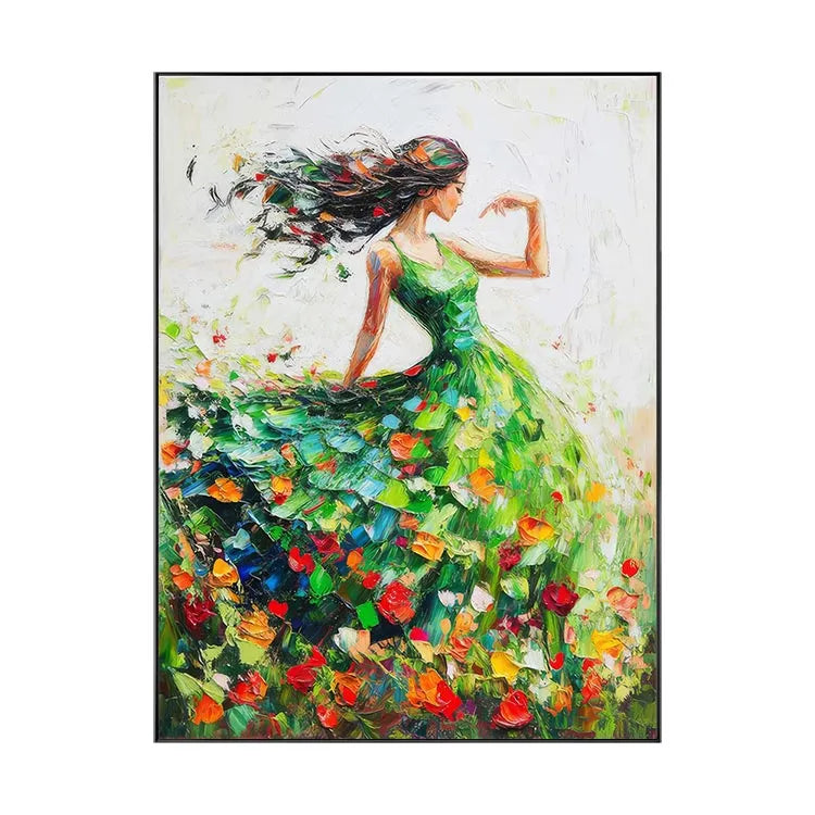 This vibrant painting, likely influenced by Impressionism, showcases a graceful woman in a flowing green dress, dancing among a field of colorful tulips. The composition emphasizes movement, with the woman's long, black hair and dress swirling dynamically. The use of color is vivid, with the bright tulip petals contrasting against the green dress and the white background, creating a sense of joy and freedom. The brushstrokes are loose and expressive, adding a textured, almost ethereal quality to the painting. Light is suggested through the delicate interplay of colors and the subtle gradations of brushwork, enhancing the sense of movement and vitality.