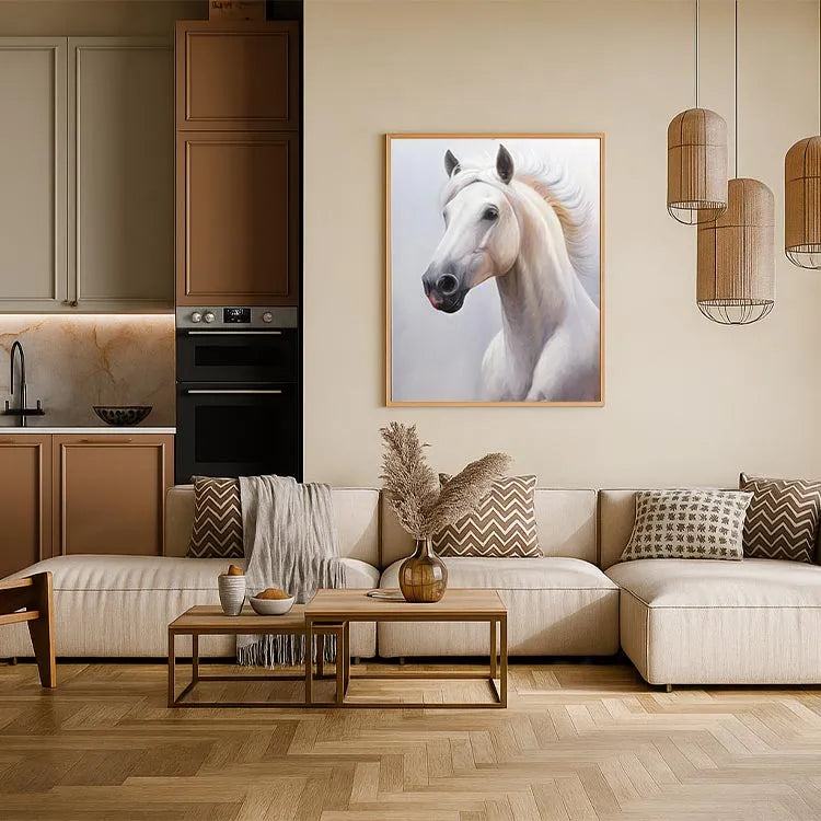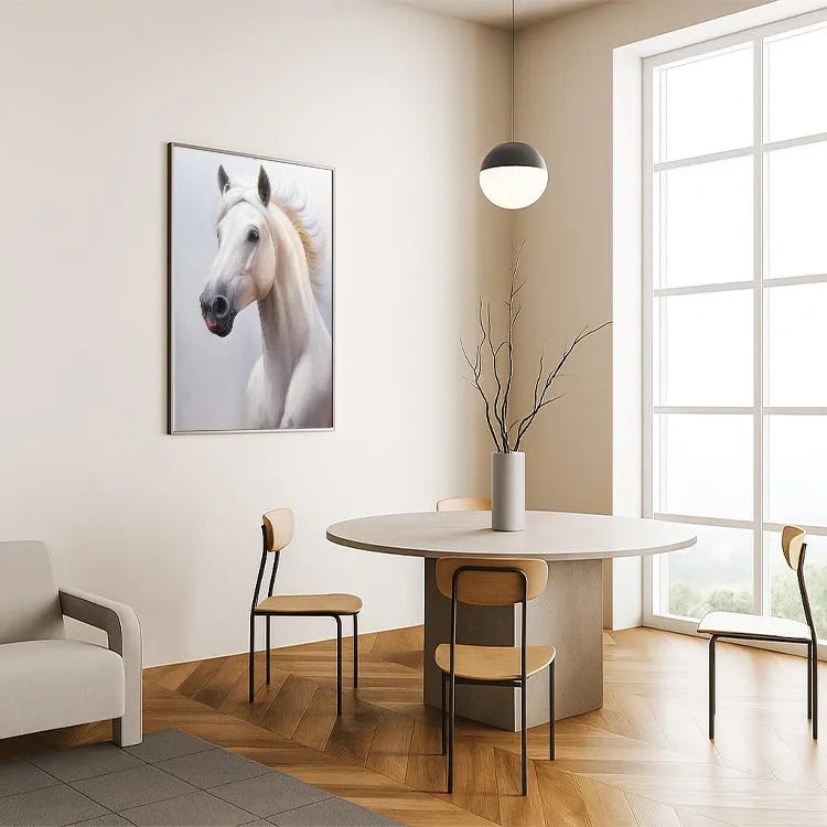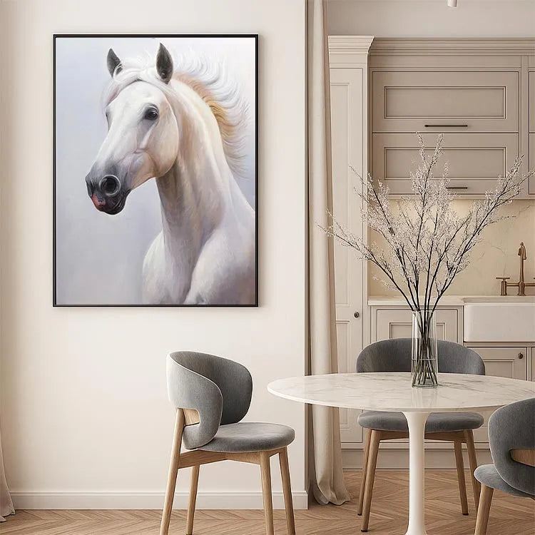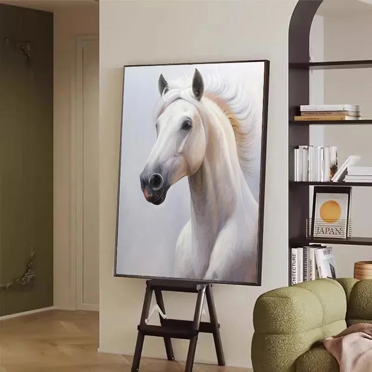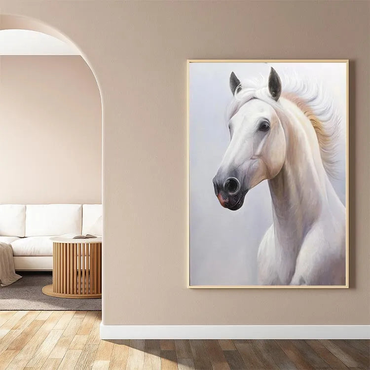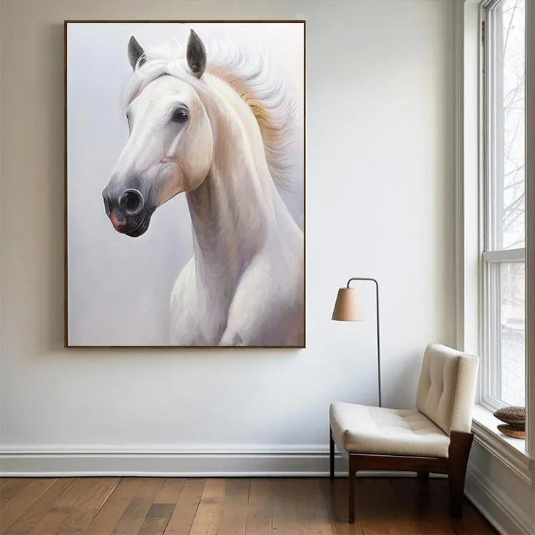 This oil painting portrays a white horse with meticulous realism, characteristic of the 19th-century Romantic movement. The artist employs delicate, smooth brushstrokes to render the horse's soft, flowing mane and textured coat, creating a lifelike yet ethereal effect. The subtle use of pastel colors, particularly the gentle gradients of white, gray, and pale pink, enhances the horse's serene and majestic presence. The light source is diffused, creating a gentle glow that highlights the horse's elegant musculature and graceful posture. The artist's attention to detail in the horse's eyes and nostrils adds depth and realism, while the slightly parted lips suggest a sense of calm and nobility. The composition's vertical orientation emphasizes the horse's noble stature, aligning with Romantic ideals of natural beauty and grandeur.