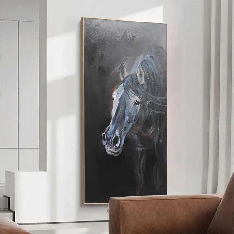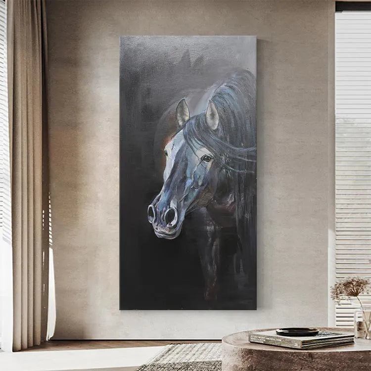 This painting is a masterful representation of a horse's head, executed in a realistic yet slightly impressionistic style. The composition is tightly focused, emphasizing the horse's face and upper neck, which creates a sense of intimacy and immediacy. The use of color is restrained, with a predominance of dark blues, blacks, and grays, which adds a somber, almost mystical atmosphere to the piece. Light is used sparingly, with subtle highlights on the horse's face and mane, drawing attention to its expressive eyes and delicate features.
