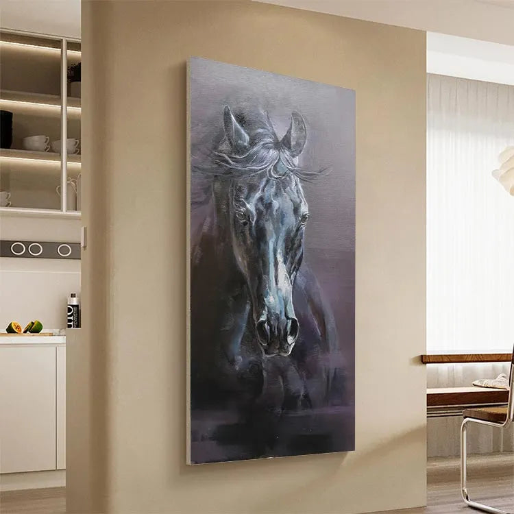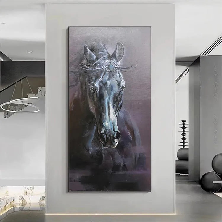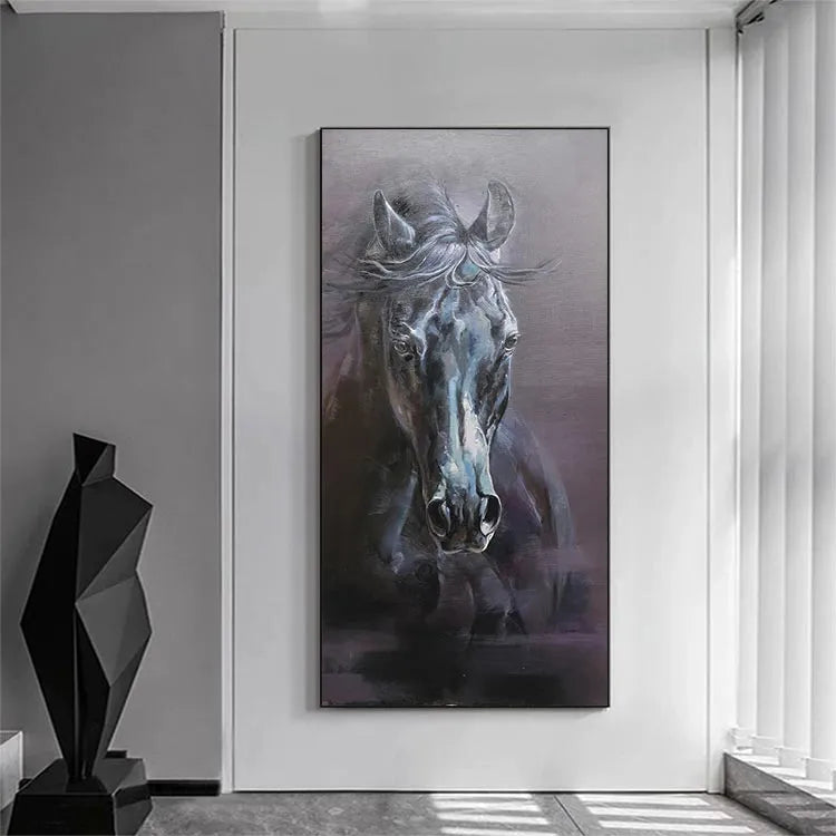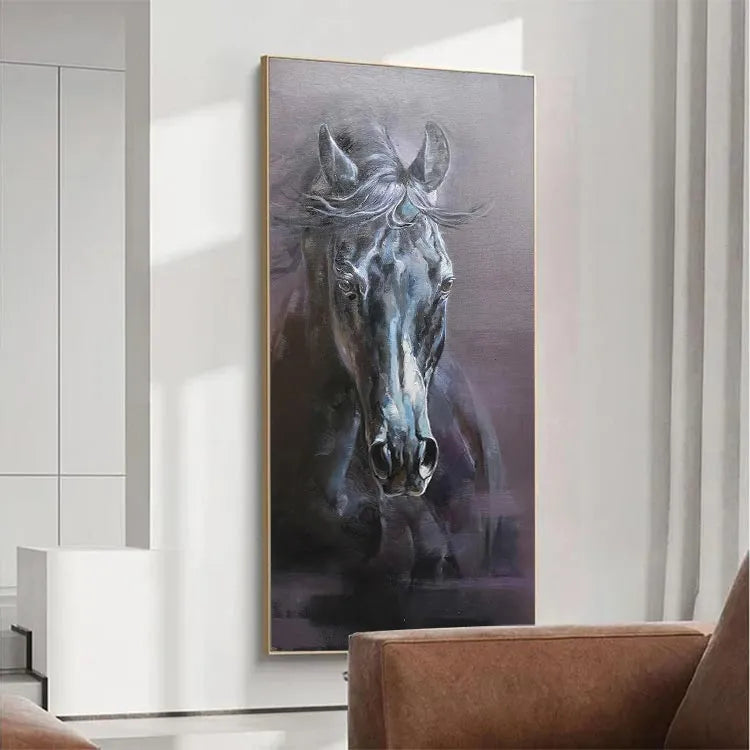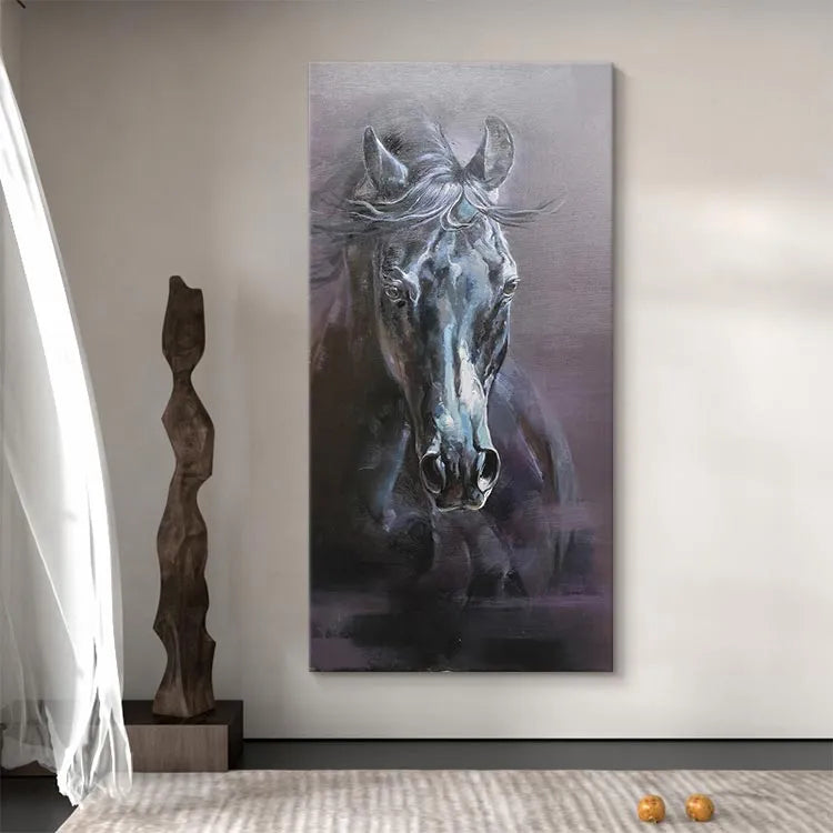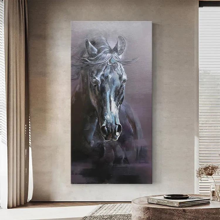 This painting depicts a horse's head in a realistic yet impressionistic style. The use of color is predominantly dark, with shades of black, gray, and blue creating a moody atmosphere. The artist employs loose, expressive brushstrokes that blend seamlessly, suggesting movement and depth. The horse's eyes are rendered with subtle white highlights, drawing attention and adding a sense of life to the composition. The light source is diffused, creating soft shadows and a three-dimensional effect. The abstract background contrasts with the detailed horse, emphasizing its form. This piece may belong to the contemporary realist movement, blending realistic elements with impressionistic techniques. The texture of the paint is visible, adding a tactile quality to the image.