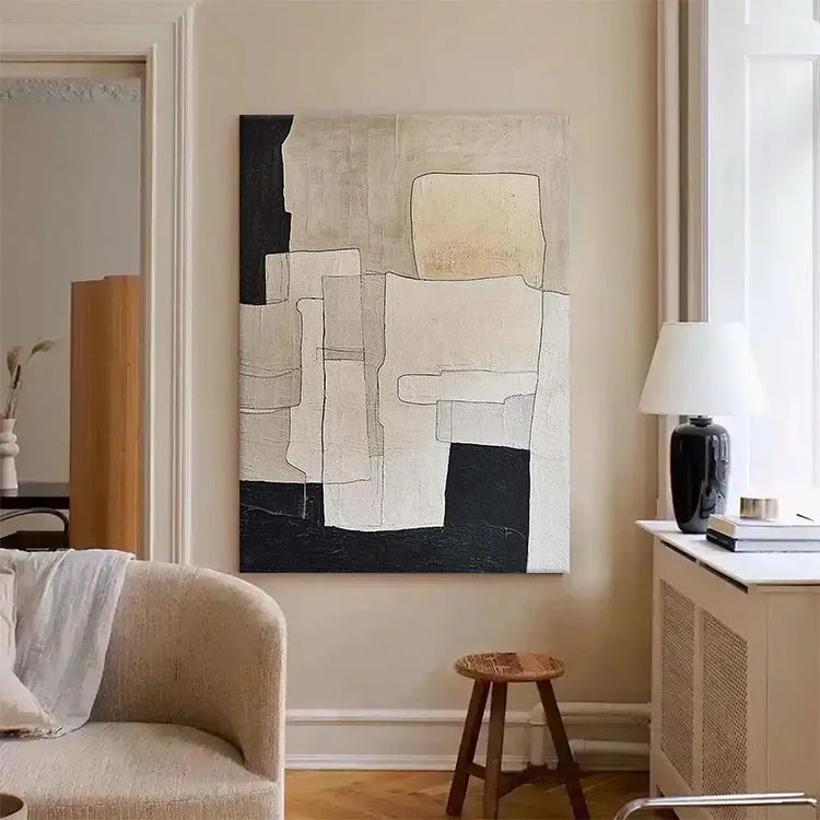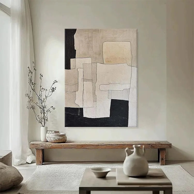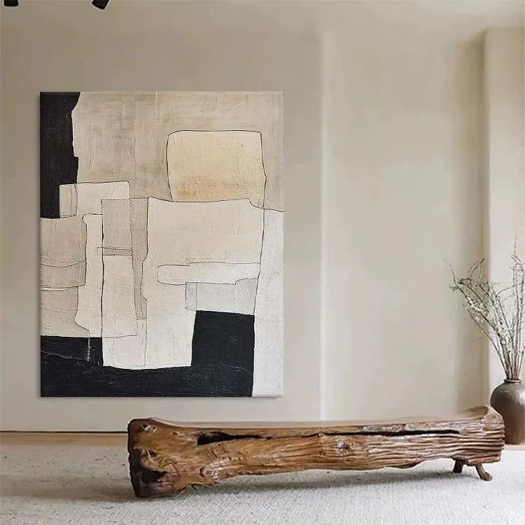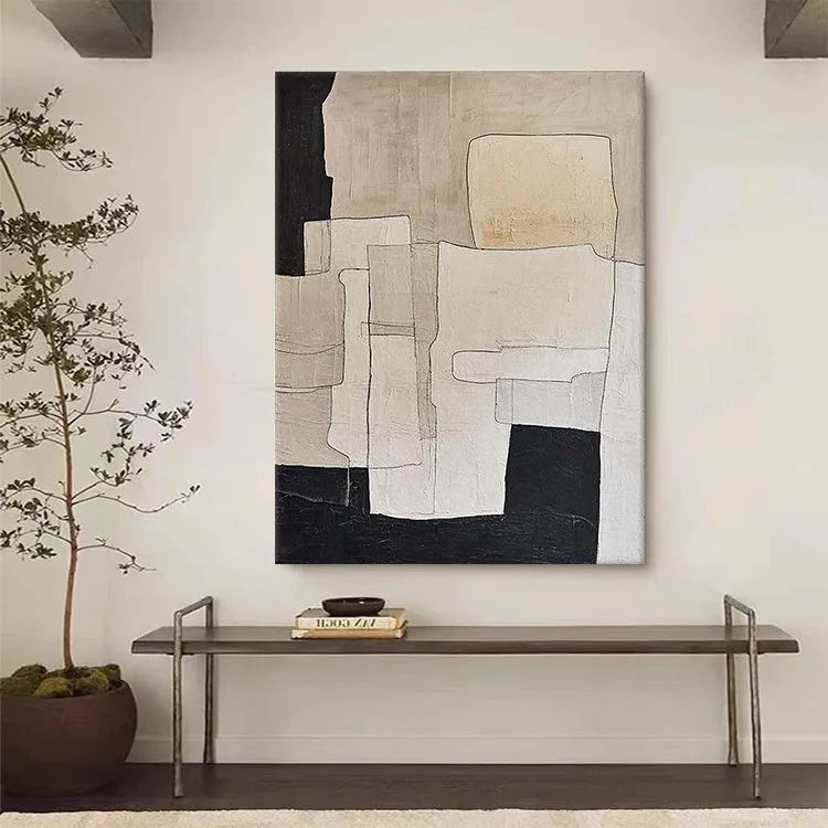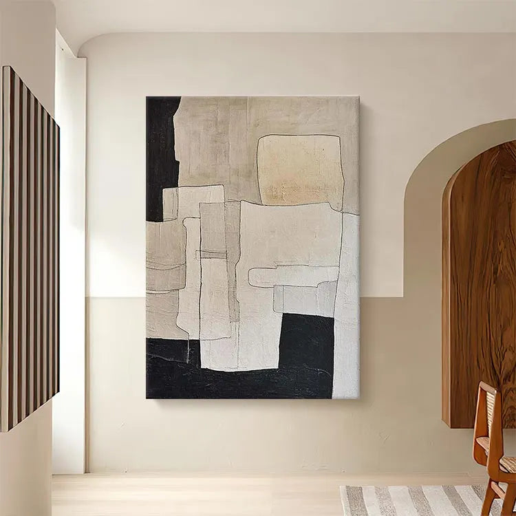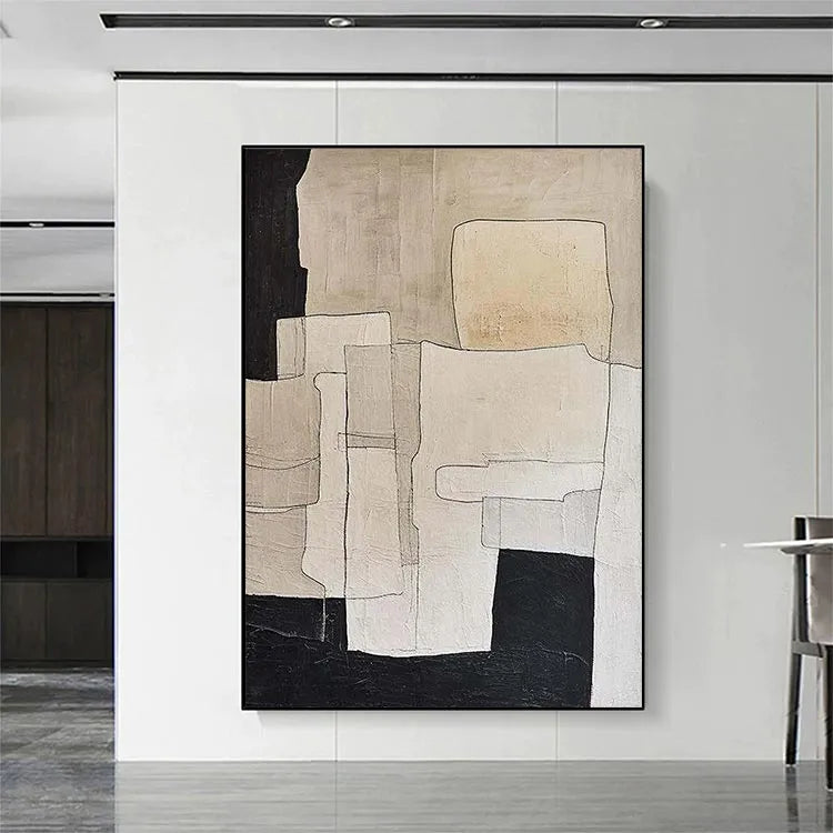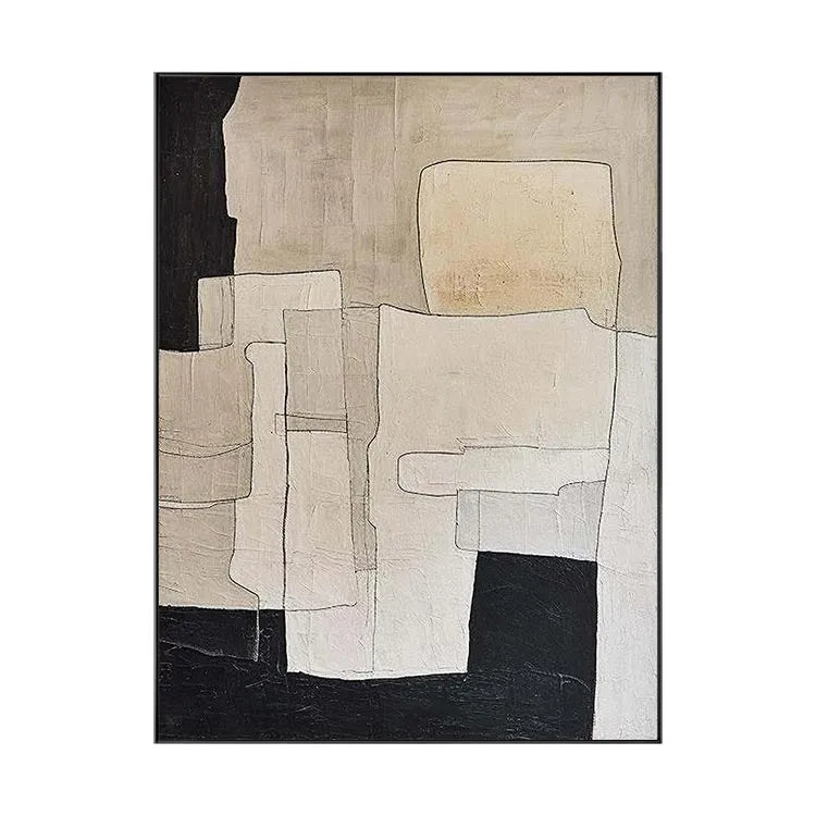 This painting exemplifies a minimalist style, characterized by its geometric abstraction and limited color palette. The composition features a series of overlapping, rectangular and square forms in varying shades of beige, white, and black, creating a sense of depth and layering. The textured brushstrokes add a tactile quality to the otherwise flat surfaces, enhancing the visual interest. The use of color is restrained yet effective, with the black providing a stark contrast that draws the viewer's eye through the composition. The subtle gradations of beige and white suggest a quiet, contemplative mood. This work aligns with the principles of the Bauhaus movement, focusing on form, function, and simplicity. The overall effect is one of quiet elegance and subtle complexity.