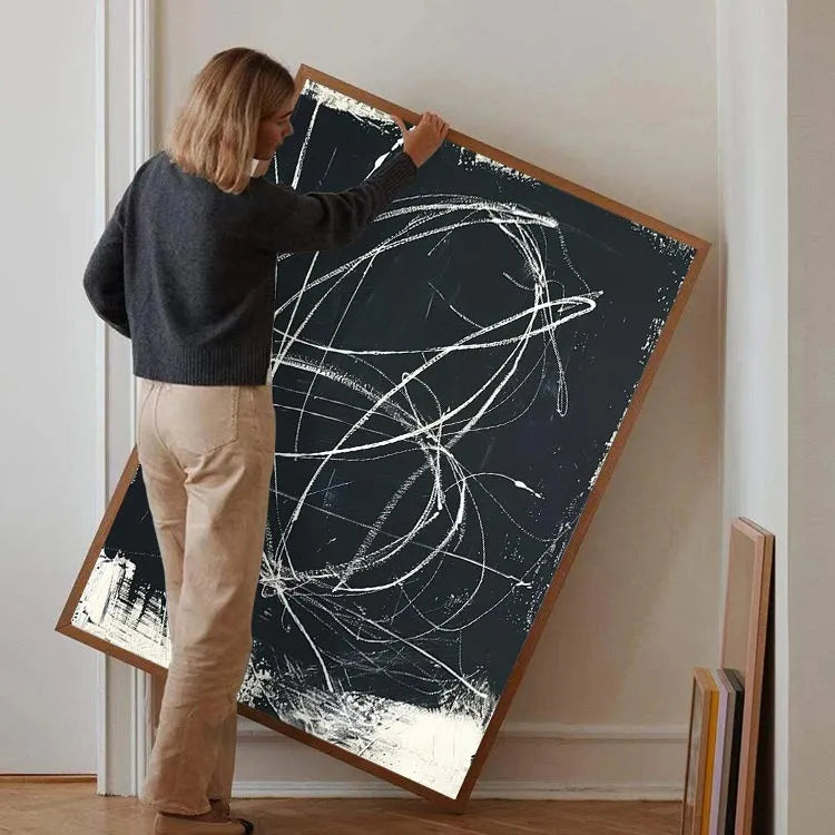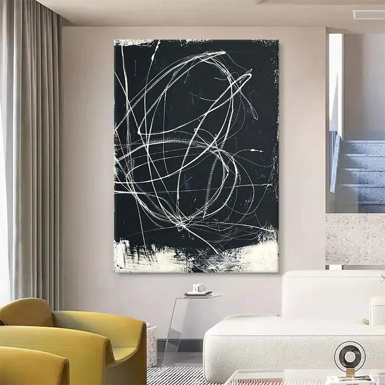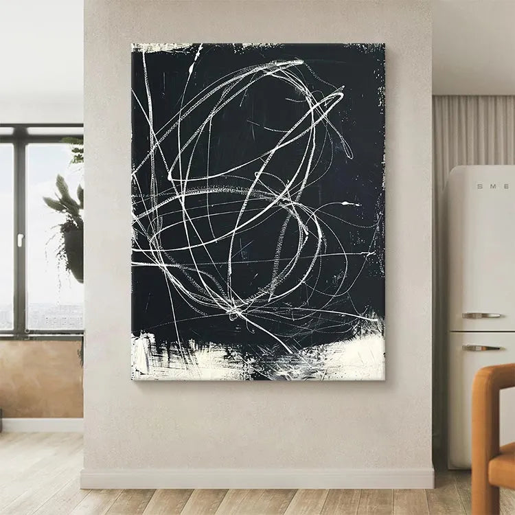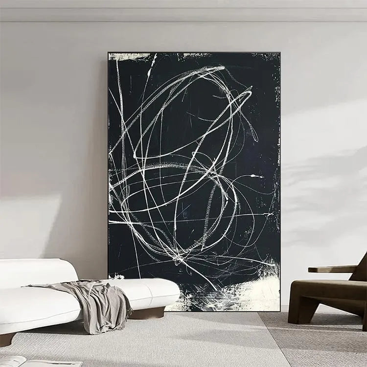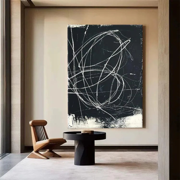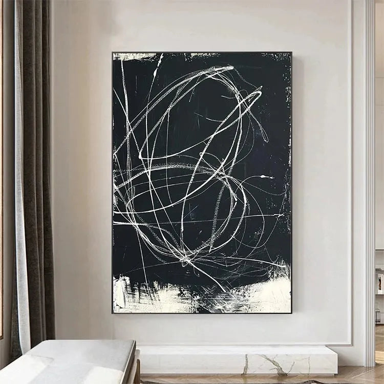 This abstract painting features a complex web of white, intersecting lines against a deep black background, evoking a sense of dynamic motion and chaos. The lines vary in thickness and direction, creating a sense of depth and layering. The stark contrast between the white and black elements draws the viewer's eye to the central chaos, emphasizing the disorder and energy within the composition. The textured brushstrokes and visible marks on the black background add a raw, tactile quality, enhancing the overall impression of spontaneity. This work aligns with the Abstract Expressionist movement, characterized by its emphasis on emotional expression and the physical act of painting. The use of minimal color and focus on line and form suggests a modernist influence, reminiscent of the works of artists like Pollock or Kandinsky.