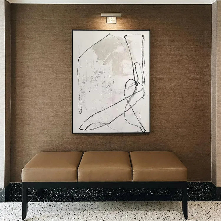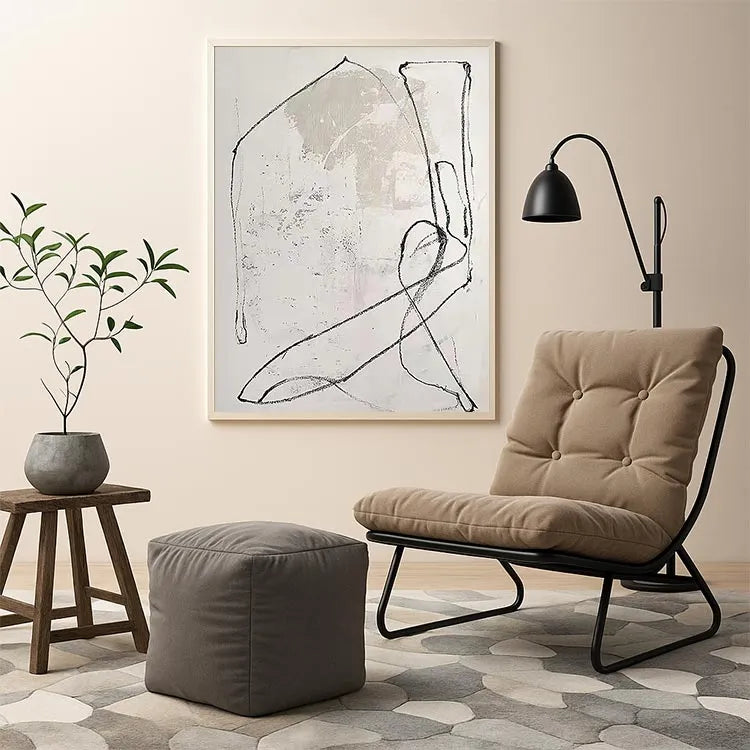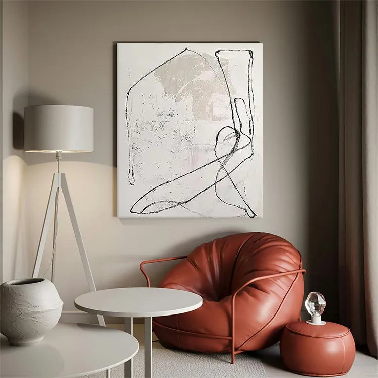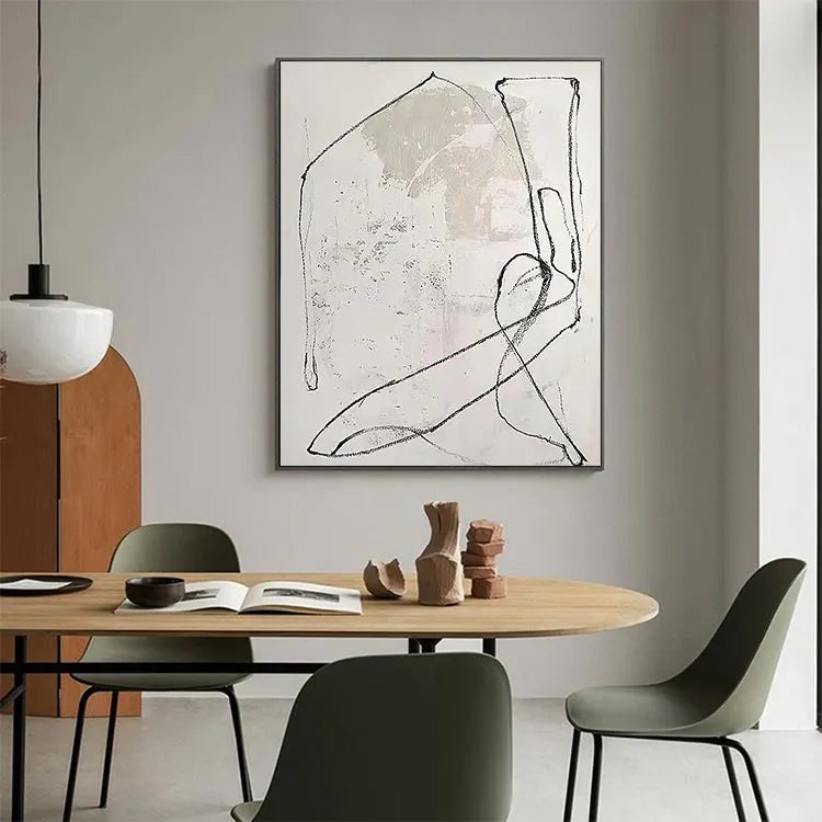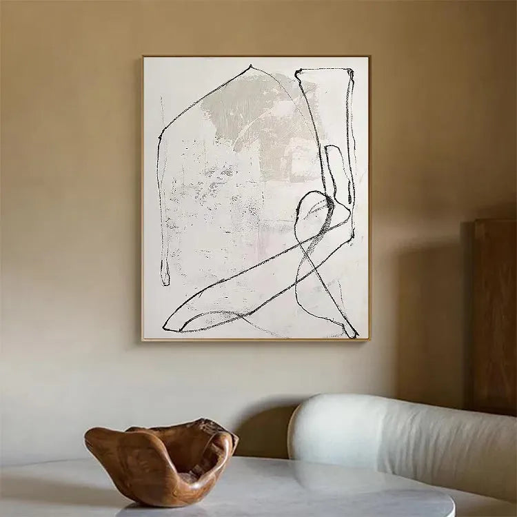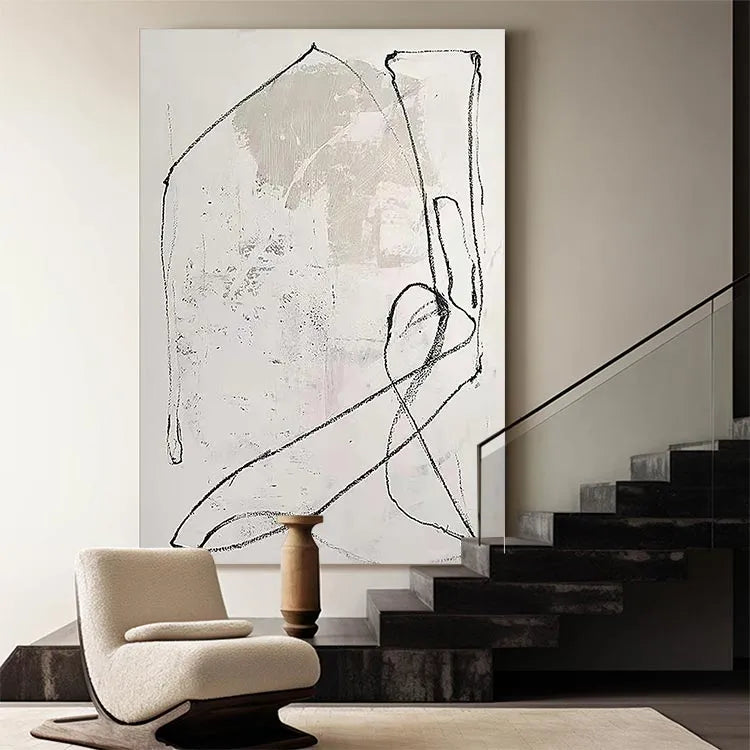 This minimalist painting employs a sparse, abstract composition characterized by thin, black, outline-like strokes on a textured, off-white background. The delicate lines intersect and overlap, creating a sense of depth and movement. The use of color is minimalistic, with subtle, pastel hues adding a gentle contrast to the otherwise monochromatic palette. The texture of the background suggests a rough, almost tactile surface, enhancing the visual interest. The abstract forms evoke a sense of ambiguity, inviting the viewer to interpret their shapes and purposes. This work aligns with the principles of minimalism and abstract expressionism, focusing on the essence of form and the interaction between line and space.
