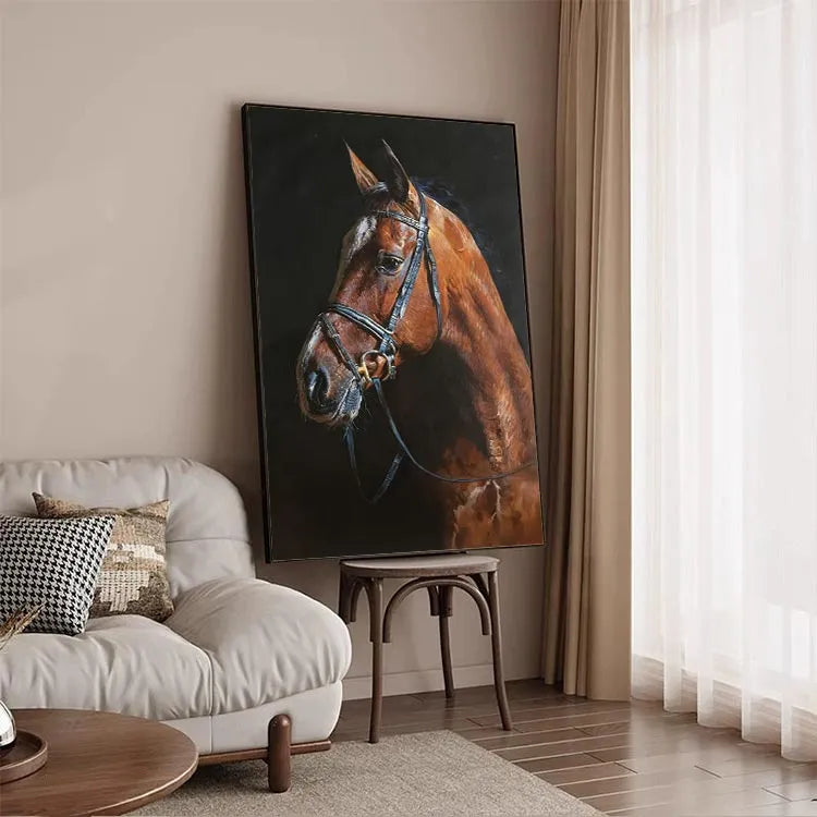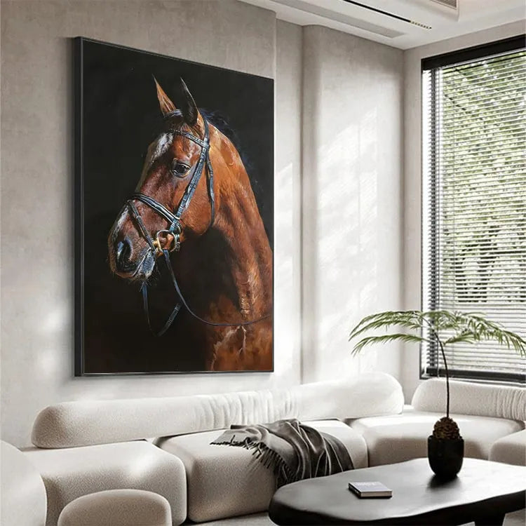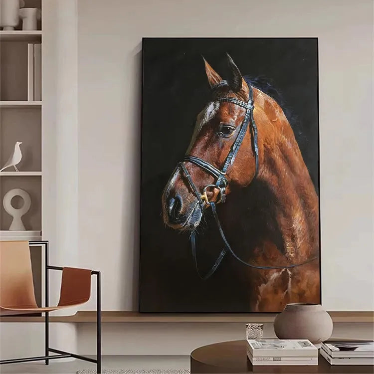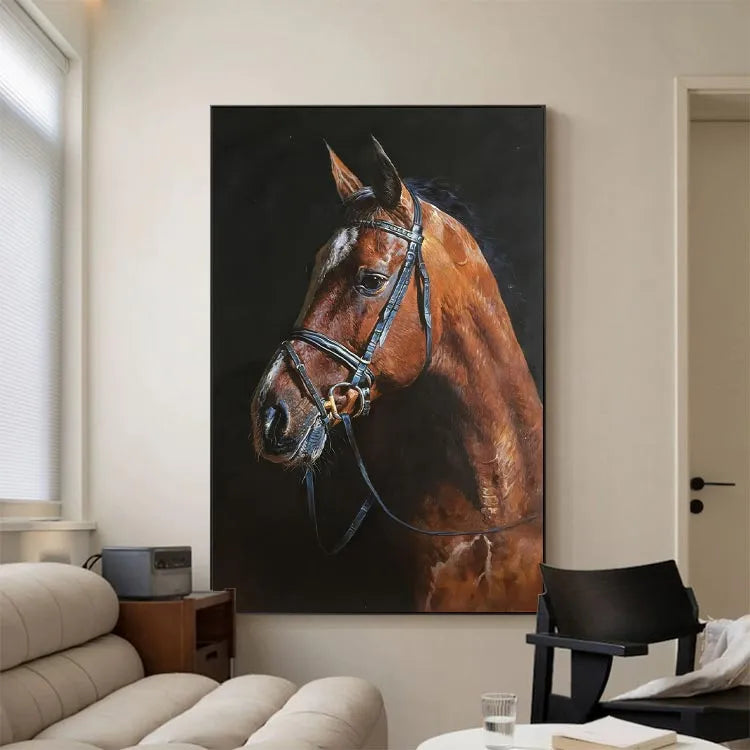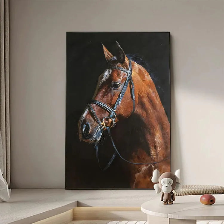 This oil painting of a brown horse's head, adorned with a black leather bridle, exemplifies realism with meticulous attention to detail. The artist employs a rich, warm color palette dominated by various shades of brown, contrasting sharply with the dark, almost black, background. The horse's coat is rendered with textured, visible brushstrokes that convey a lifelike, almost tangible quality. Light is skillfully used to highlight the horse's musculature and the sheen of its coat, while the bridle's metallic elements catch the light subtly. The composition is balanced, focusing on the horse's profile, and the subtle use of chiaroscuro enhances the three-dimensionality. This work aligns with the realism movement, emphasizing naturalism and the detailed representation of the subject.