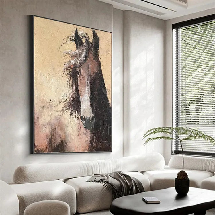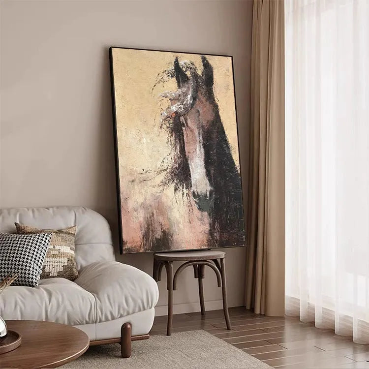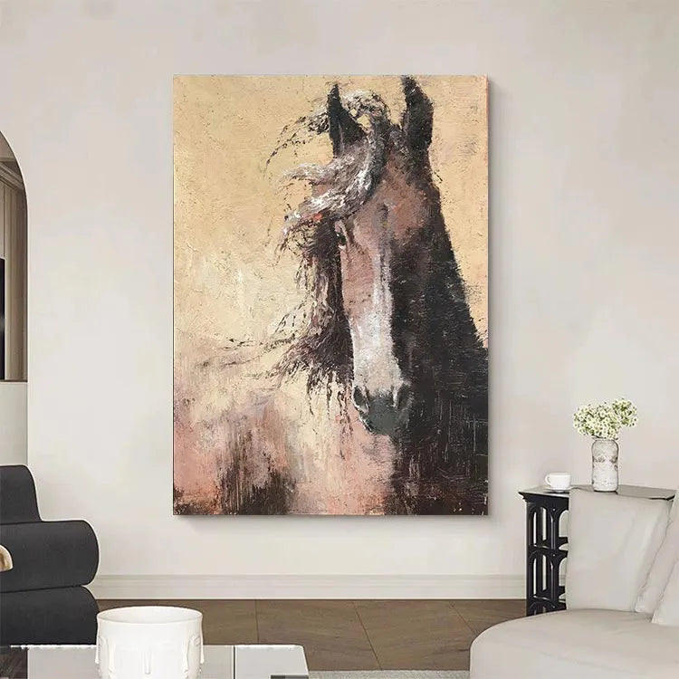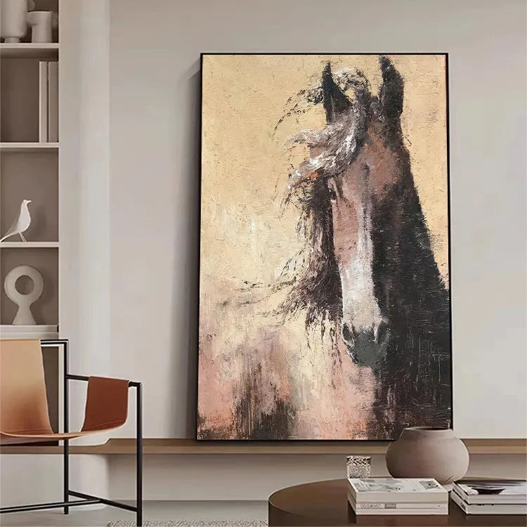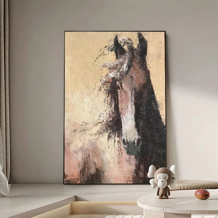 This oil painting features a dynamic portrait of a horse, characterized by its expressive, flowing mane and intense, contemplative gaze. The artist employs a textured, almost abstract style, with visible brushstrokes that add a sense of movement and vitality to the piece. The color palette is subdued, with earthy browns, muted whites, and soft pinks, creating a harmonious yet subtle contrast that draws attention to the horse's face. The light source is diffuse, casting gentle shadows that enhance the horse's three-dimensional form. This work aligns with the Romantic movement, emphasizing emotional connection and the sublime beauty of nature. The textured, almost impressionistic technique adds a tactile quality, enhancing the painting's emotional depth and realism.