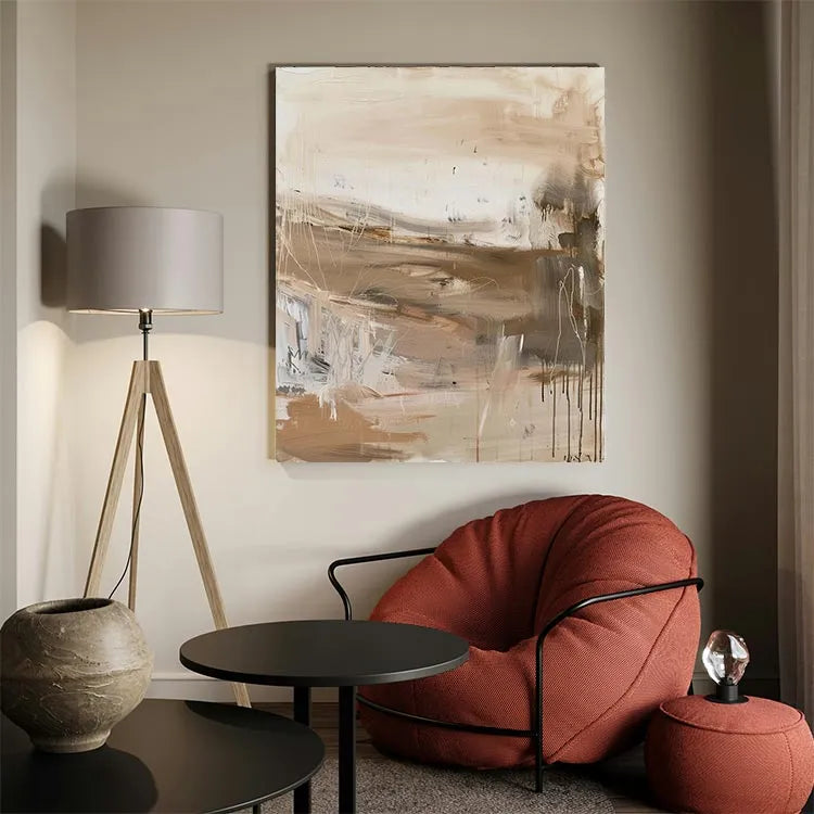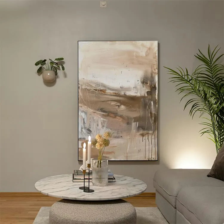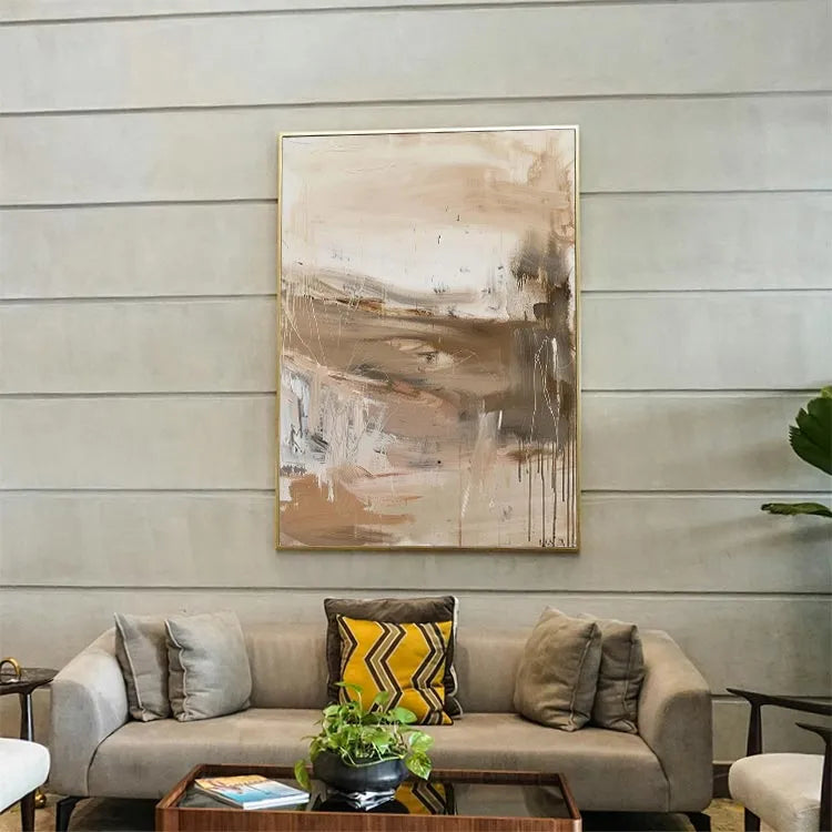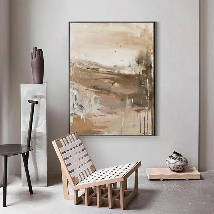 This abstract painting employs a restrained palette of earthy browns, muted whites, and subtle grays, creating a serene, yet dynamic composition. The textured brushstrokes and visible layers suggest a process-oriented approach, reminiscent of the Abstract Expressionist movement. The horizontal and vertical strokes interact, forming a sense of movement and depth, while the interplay of light and dark areas adds a subtle, yet compelling, sense of rhythm. The use of drips and thick applications of paint introduces an element of spontaneity, contrasting with the otherwise controlled composition. The overall effect is a harmonious blend of spontaneity and deliberation, evoking a contemplative, almost meditative mood.