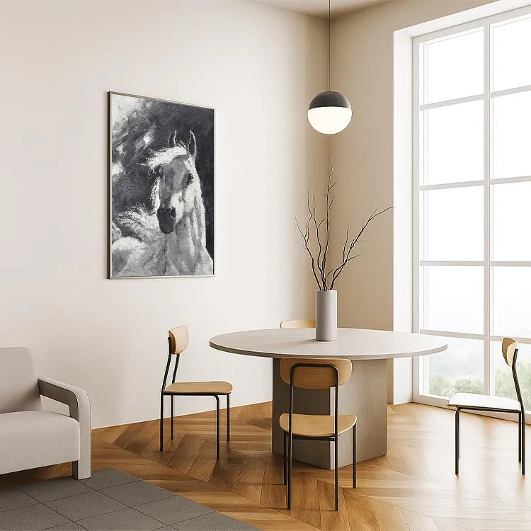 This oil painting of a horse employs a monochromatic palette, predominantly using shades of black, white, and gray. The artist utilizes thick, expressive brushstrokes that create a textured, almost abstract background, contrasting with the more defined, yet still impressionistic, portrayal of the horse's head and mane. The use of light and shadow is masterful, with the horse's face and mane illuminated against a darker backdrop, suggesting a sense of depth and three-dimensionality. The painting's style is reminiscent of the Impressionist movement, focusing on capturing the essence and movement of the subject rather than precise detail. The brushwork is dynamic and energetic, contributing to the painting's overall sense of motion and life. The horse's calm, yet slightly inquisitive expression is effectively conveyed through the subtle interplay of light and shadow.