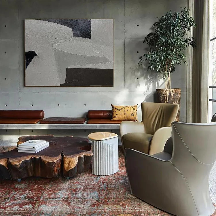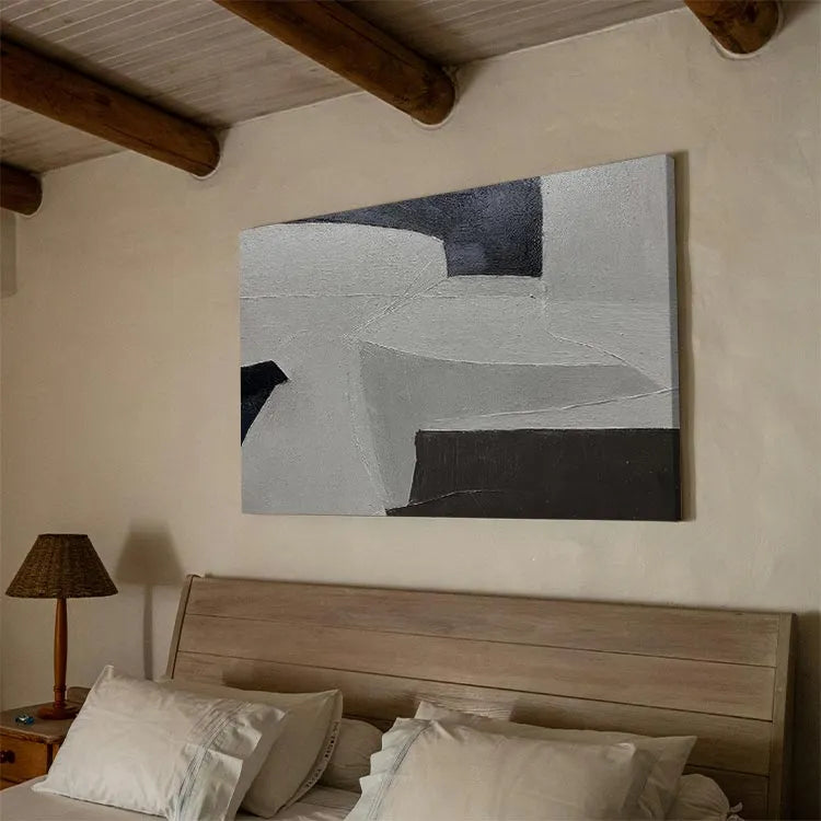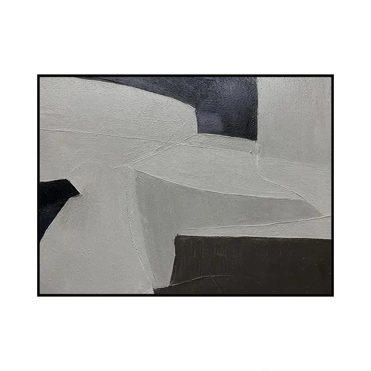 This oil painting exhibits characteristics of geometric abstraction, reminiscent of the Cubist movement. The composition features sharp, angular forms and a limited color palette, primarily consisting of muted whites, blacks, and grays. The textured brushwork creates a tactile, almost three-dimensional effect, enhancing the geometric shapes. The use of contrasting dark and light areas suggests a play of light and shadow, adding depth to the otherwise flat forms. The interplay of colors and textures evokes a sense of spatial complexity and ambiguity. The subtle, almost imperceptible lines and the careful gradation of color suggest a modernist approach, focusing on form and structure over representational content.