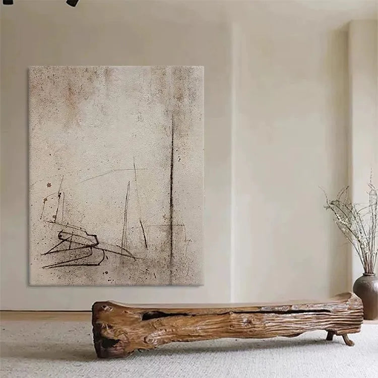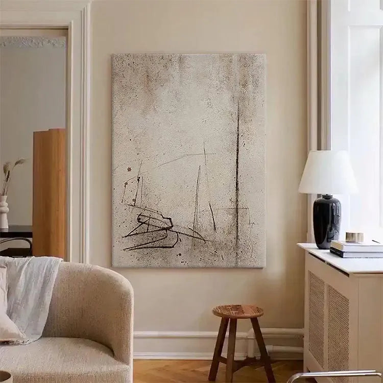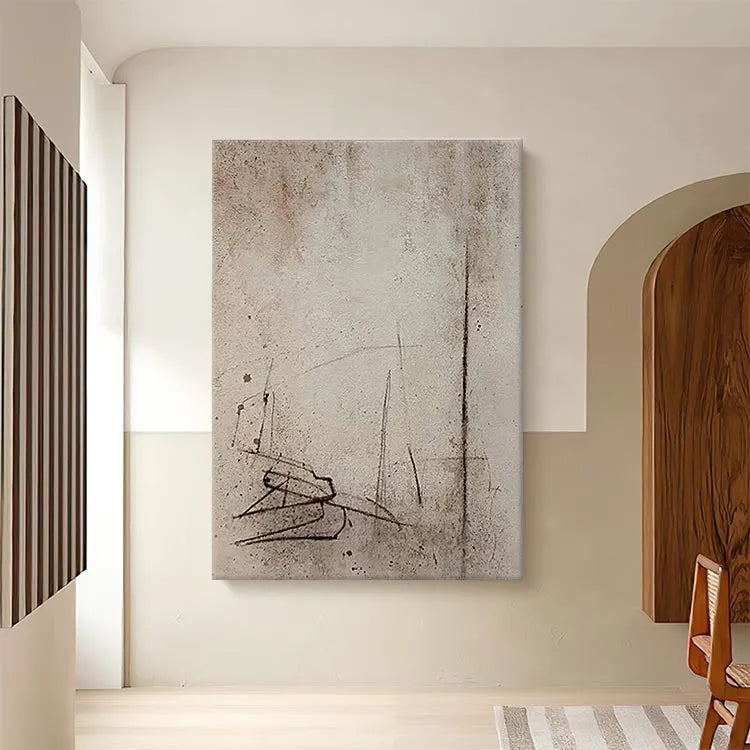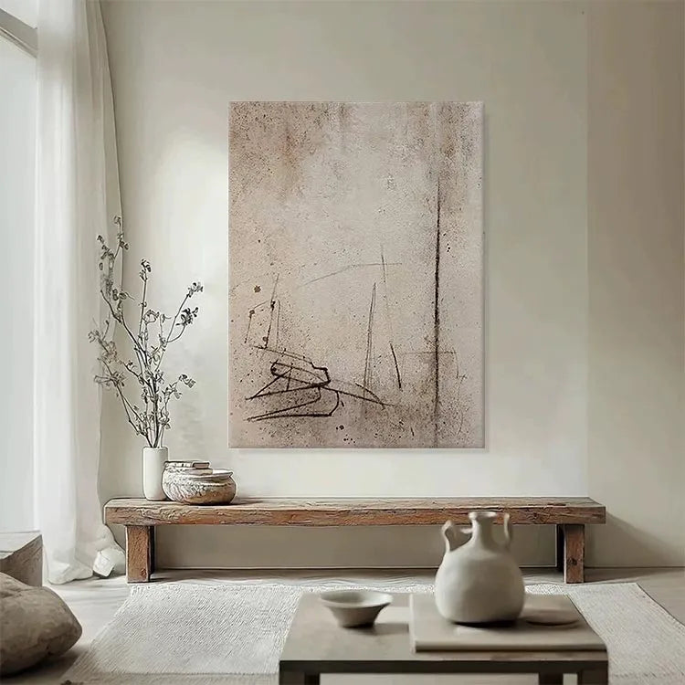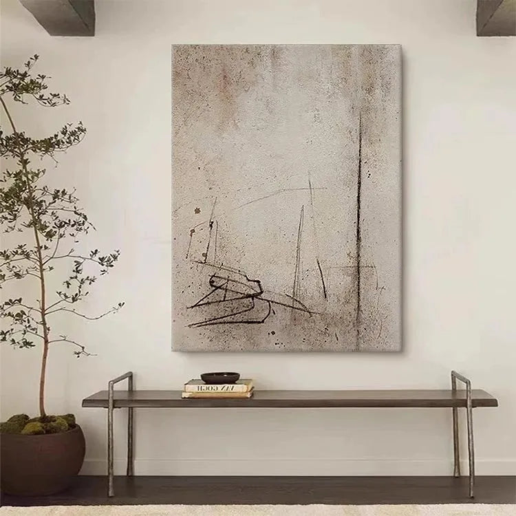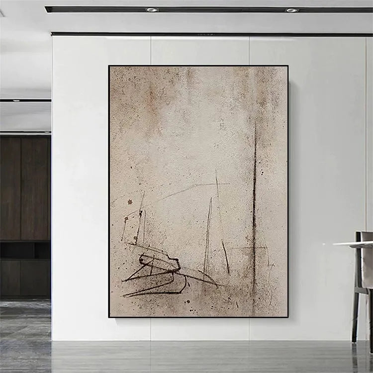 This minimalist painting employs a restrained palette of beige and brown tones, emphasizing the texture of the rough, slightly stained canvas. The sparse, black, sketch-like lines create a sense of geometric abstraction, reminiscent of the early 20th-century movements such as Bauhaus or De Stijl. The lines, with their thin, linear quality, suggest architectural forms or skeletal structures, adding a subtle sense of depth and perspective. The vertical and diagonal lines intersect and overlap, creating a dynamic yet minimalist composition. The texture of the canvas is prominent, with visible grain and subtle variations in color, enhancing the raw, unfinished aesthetic. The overall effect is one of quiet, contemplative simplicity, inviting viewers to ponder the interplay between form and surface.