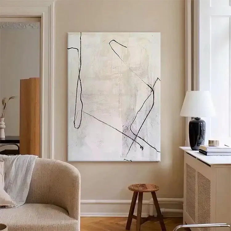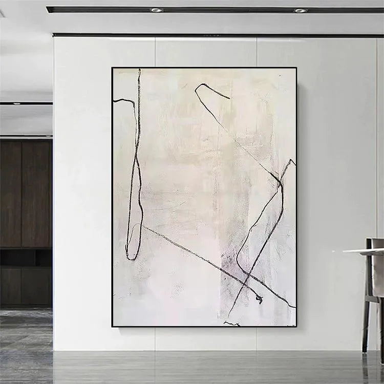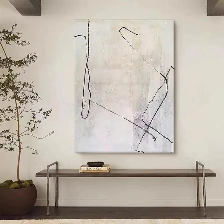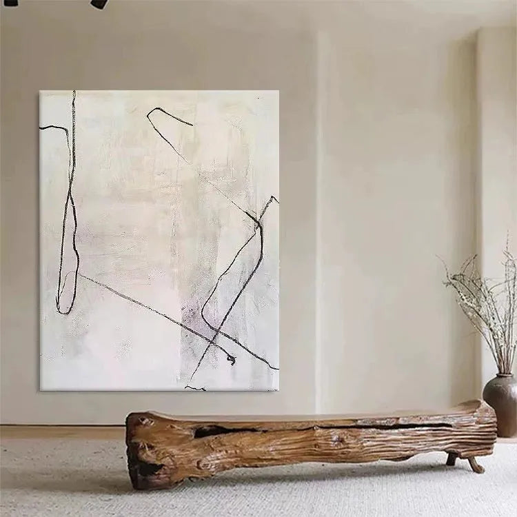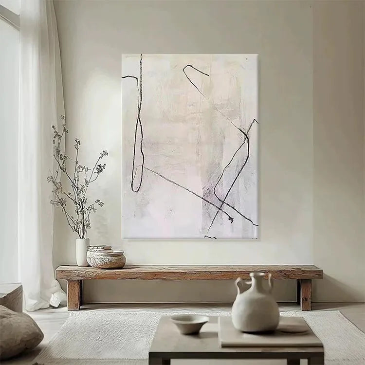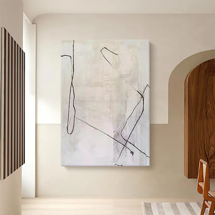 This abstract painting employs minimalist and gestural techniques, characterized by its sparse use of color and simple, yet dynamic line work. The composition features a series of black, fluid, and slightly erratic lines that intersect and curve across a textured, pale beige background. The lines suggest movement and directionality, while the textured surface adds a tactile quality, enhancing the visual experience. The subtle gradation of colors in the background, ranging from light cream to faint lavender, creates a sense of depth and subtle contrast. This work aligns with the Abstract Expressionist movement, emphasizing spontaneity and emotional expression over realism. The interplay between the thin, delicate lines and the textured background evokes a sense of quiet contemplation and introspection.