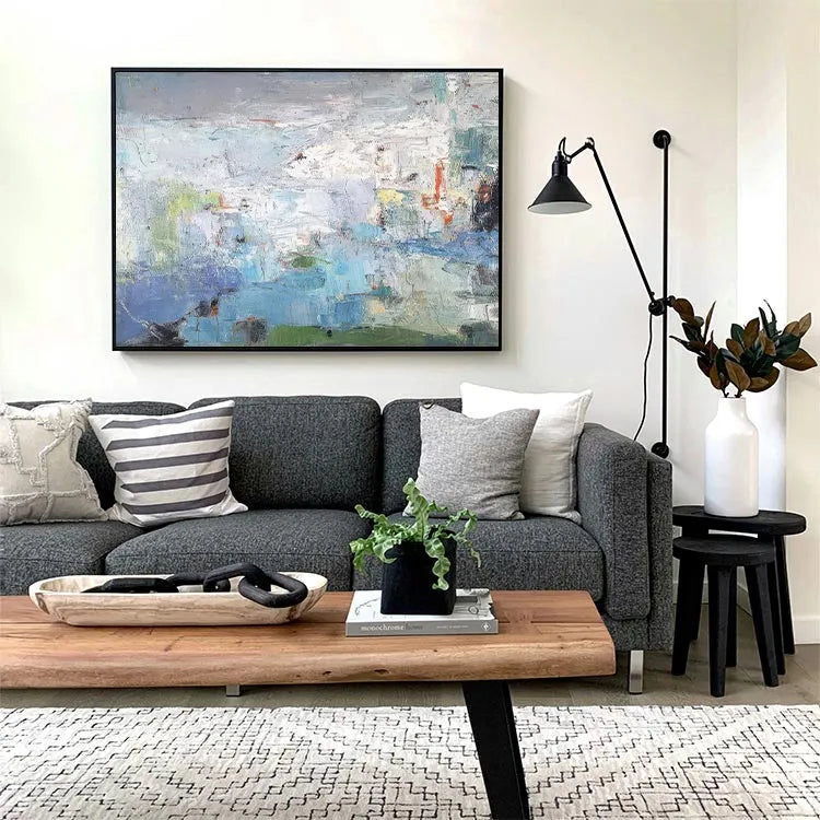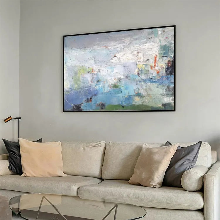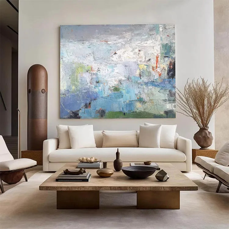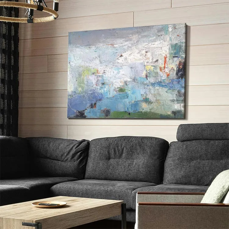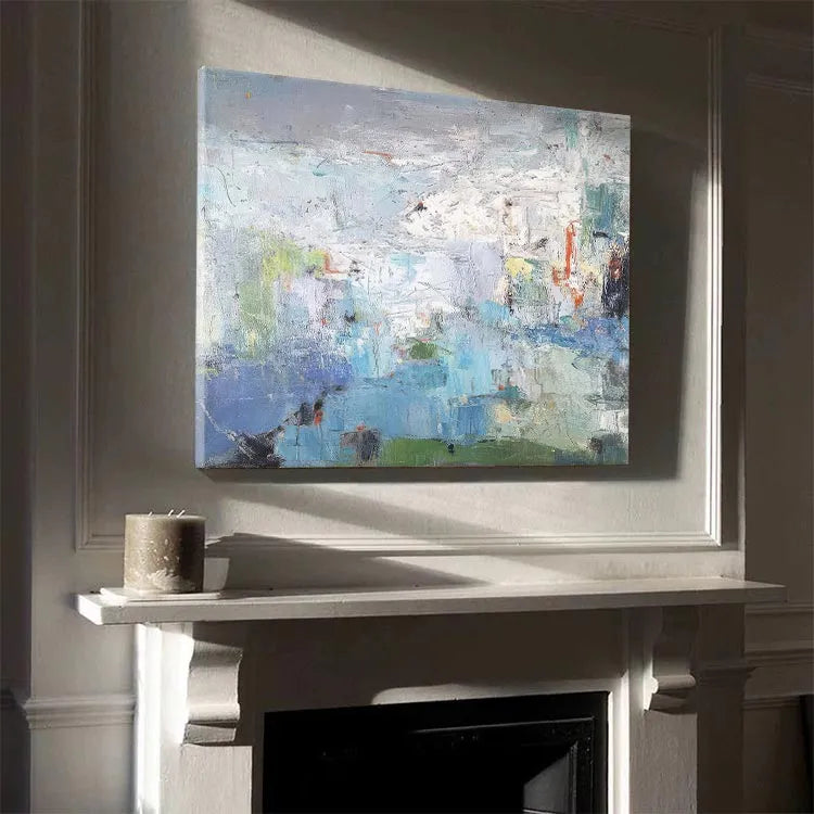 This abstract painting exhibits a textured, layered composition, with visible brushstrokes and a mixed palette of blues, greens, whites, and subtle oranges. The rough, impasto texture suggests a tactile quality, inviting the viewer to engage with the surface. The color interactions create a sense of depth and movement, while the abstract forms evoke a non-representational landscape. The use of light and shadow is subtle, with the white and gray tones providing a neutral backdrop that contrasts with the brighter, more saturated hues. This work aligns with the Abstract Expressionism movement, emphasizing emotional and spontaneous creation. The loose, gestural brushwork and the blending of colors convey a dynamic, yet calm, atmosphere.