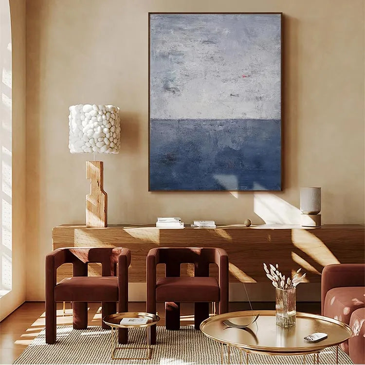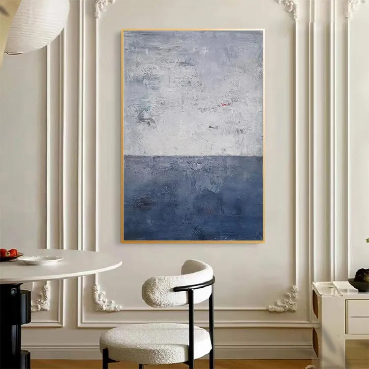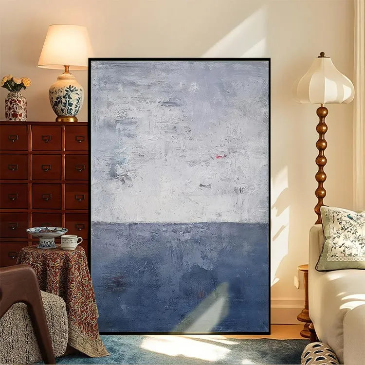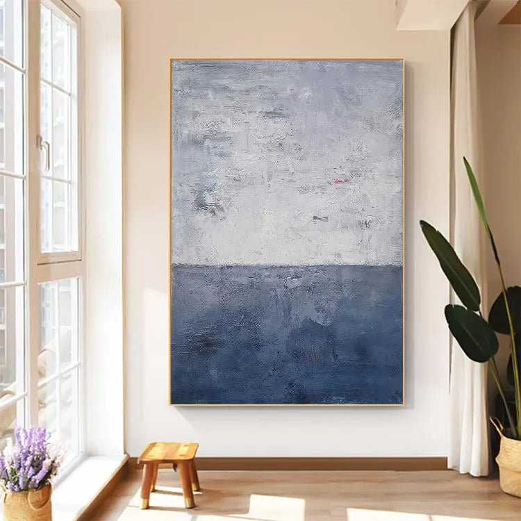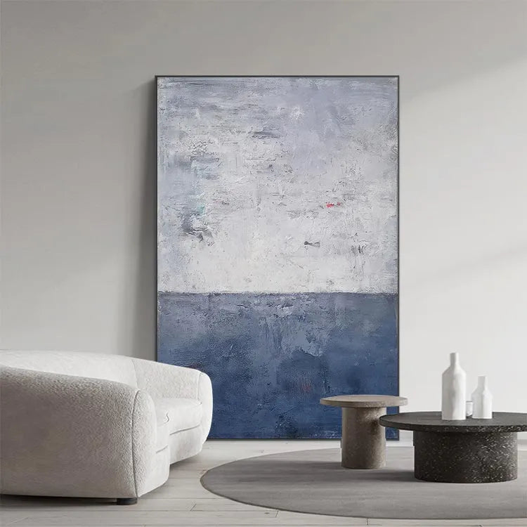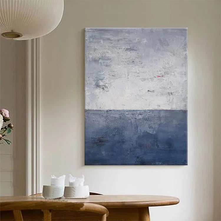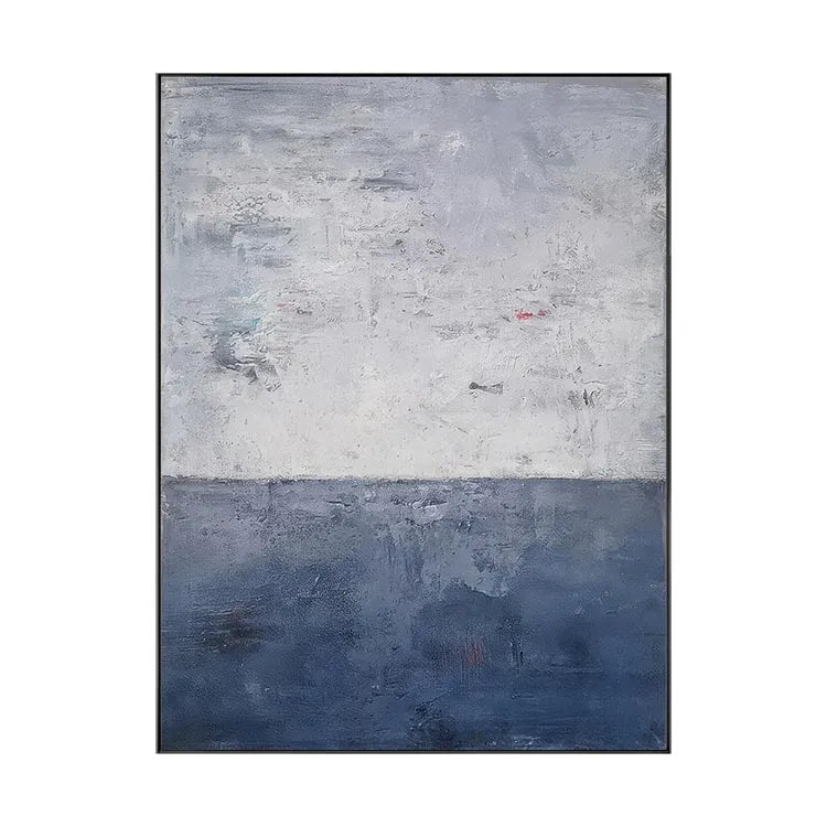 This oil painting employs a minimalist, abstract style, characterized by its restrained color palette and textured brushwork. The composition is divided horizontally into two distinct sections: the upper half is a pale, almost white, textured surface with subtle, ghostly brushstrokes, while the lower half transitions into a deeper, darker blue with a more pronounced texture. The use of color suggests a contrast between the ethereal upper realm and the grounded lower section. The texture, achieved through visible brushstrokes and impasto, adds a tactile quality, enhancing the painting's emotional depth. The sparse, yet deliberate, use of red and blue hues evokes a sense of calm and introspection, aligning with the principles of Abstract Expressionism. The painting's simplicity and emotional resonance invite the viewer to ponder its symbolic nature.