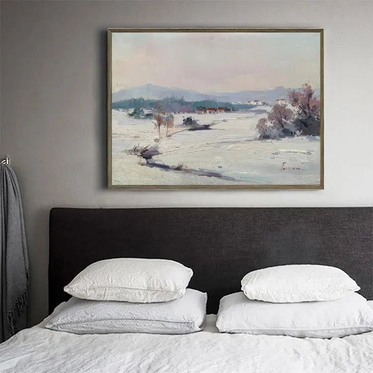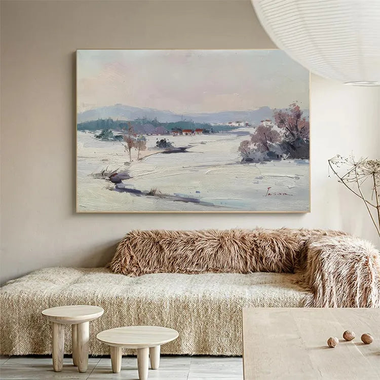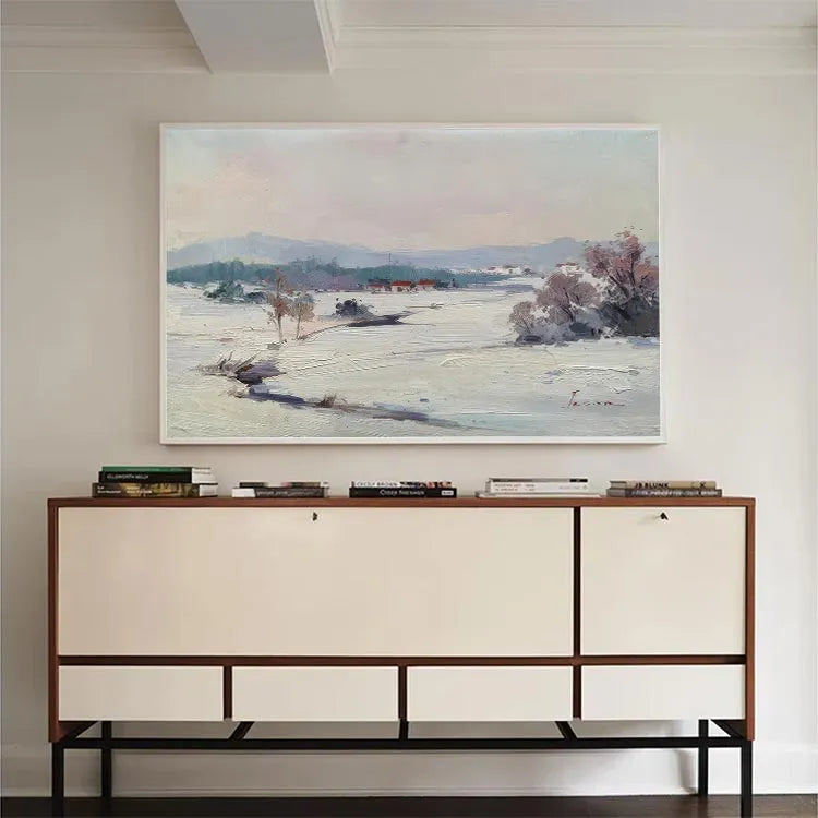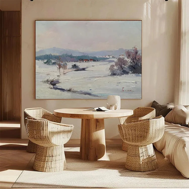 This oil painting, likely belonging to the Realism movement, depicts a serene winter landscape. The artist employs a restrained color palette dominated by soft whites and pale blues, evoking a tranquil, almost melancholic atmosphere. The composition balances the foreground's textured, snow-covered ground with the softly blurred background, creating depth. The use of light is subtle, with diffused sunlight casting gentle shadows, enhancing the painting's calm mood. Brushstrokes are visible yet controlled, adding texture to the snow and foliage. The sparse, delicate trees and distant buildings suggest a quiet, isolated village. The signature "Ison" in the bottom right corner indicates the artist's identity.