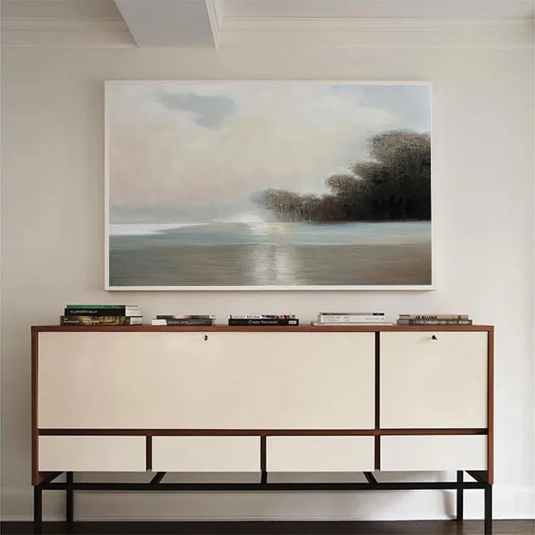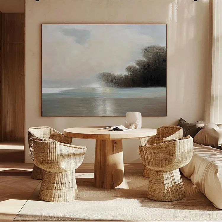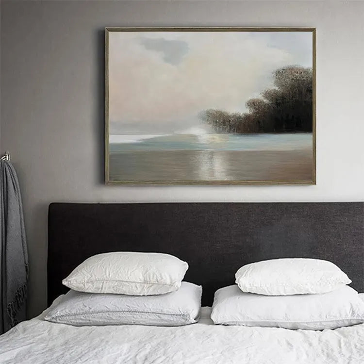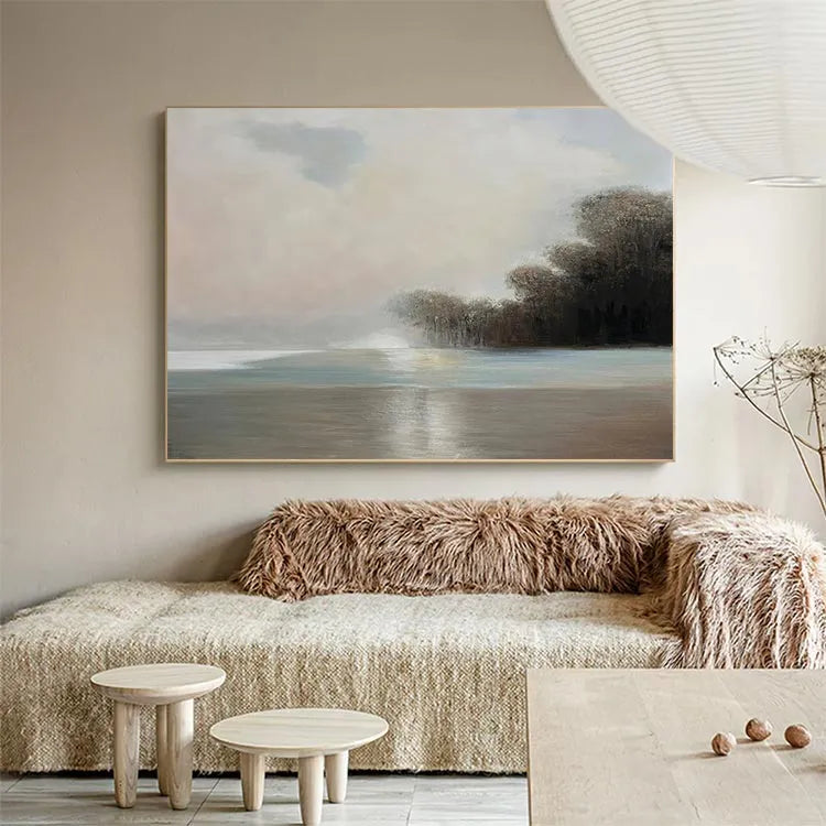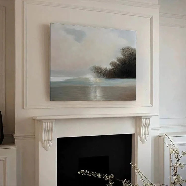 This oil painting exemplifies the Romantic movement's emphasis on nature's sublime beauty. The composition employs a serene, horizontal landscape with a reflective water surface that leads the eye towards a misty, tree-lined horizon. The use of soft, diffused light creates a tranquil, almost ethereal atmosphere. The color palette is restrained, with muted earth tones and gentle blues, enhancing the painting's calming effect. The texture is smooth, with subtle brushstrokes that suggest the delicate play of light and shadow. The foggy, indistinct trees on the right suggest mystery and the passage of time, while the reflective water adds a sense of stillness and introspection. The overall effect is one of quiet contemplation and natural beauty.