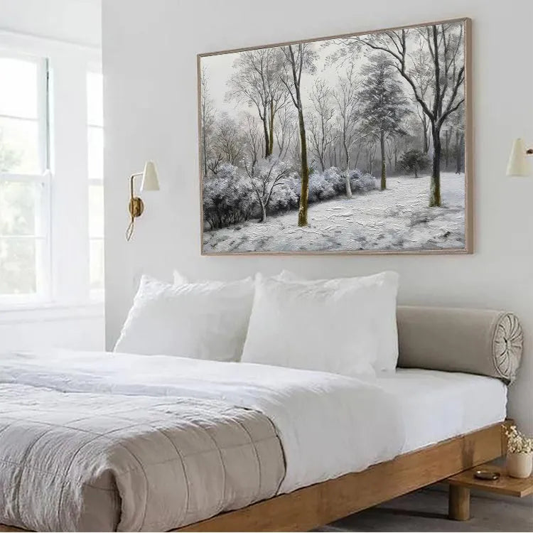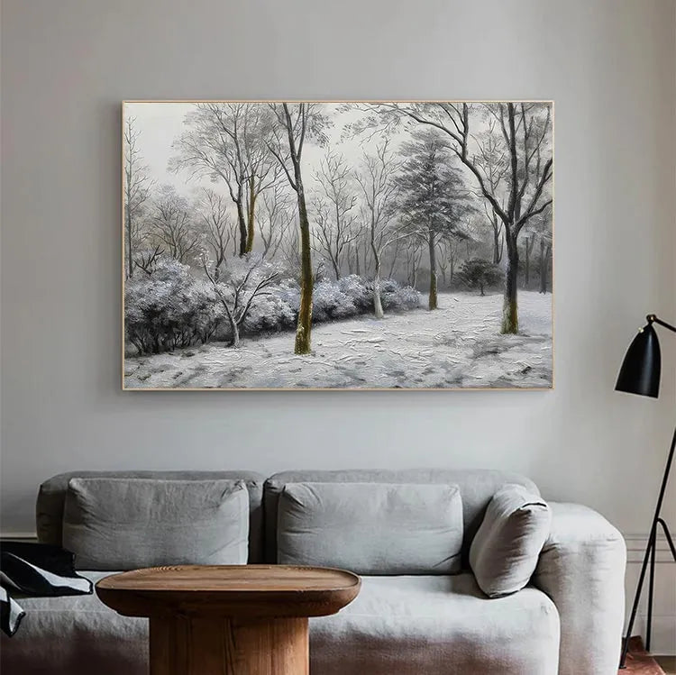 This oil painting, likely belonging to the Romantic movement, captures a serene winter forest scene with meticulous attention to detail. The composition is balanced, with tall, slender trees and dense bushes creating a natural frame around the snowy ground. The artist employs a limited color palette dominated by whites, grays, and muted greens, enhancing the cold, tranquil atmosphere. Light is subtly diffused, creating a misty effect that adds depth and a sense of quiet solitude. Textures are carefully rendered, with visible brushstrokes in the snow and foliage, adding realism and a tactile quality. The gentle, almost ethereal style suggests an appreciation for nature's beauty and a contemplative mood.